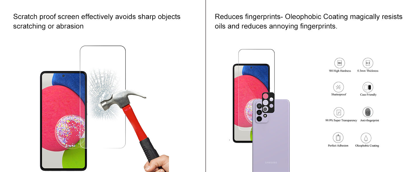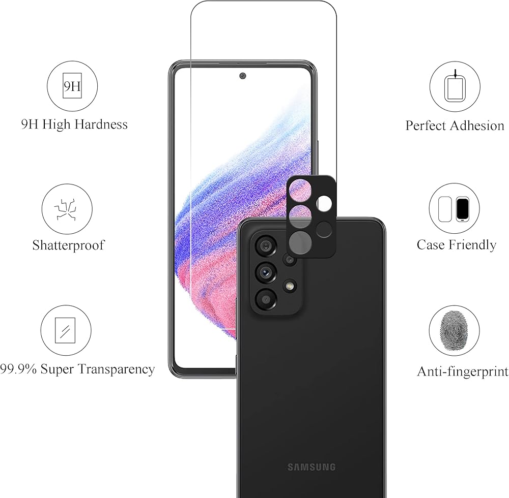 - يعمل مع واقي الشاشة الزجاجي المقوى Galaxy A53 5G وواقي عدسة الكاميرا. يتميز بأقصى قدر من الحماية من الخدوش والخدوش والصدمات.