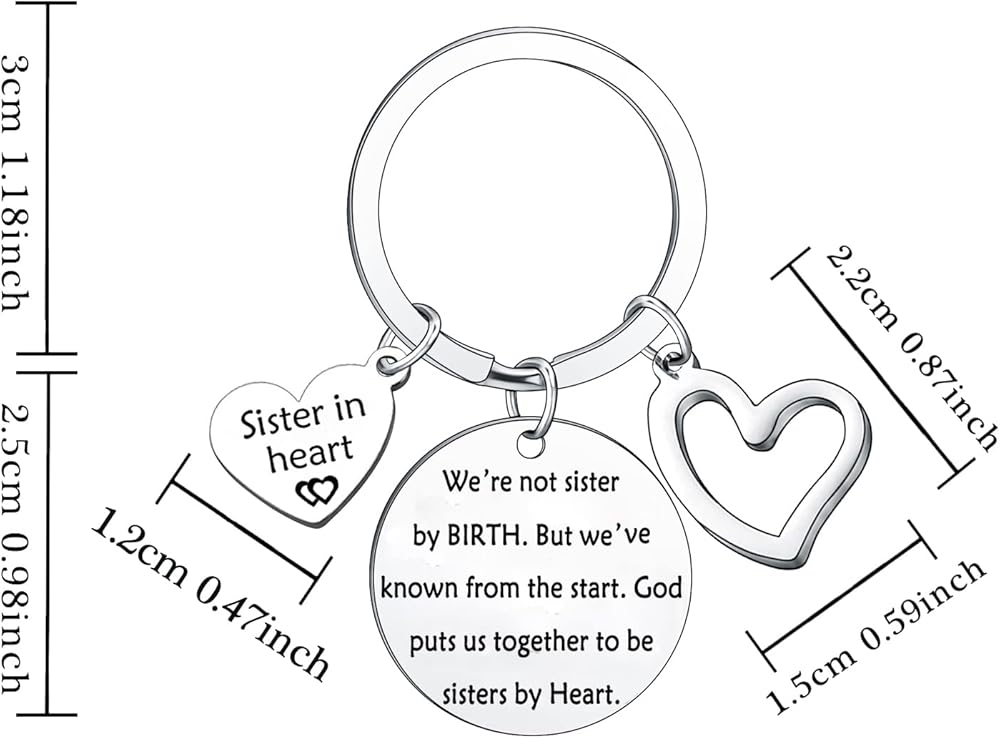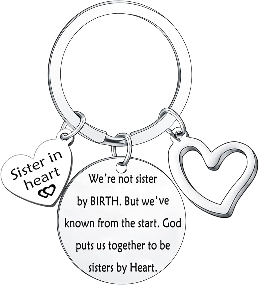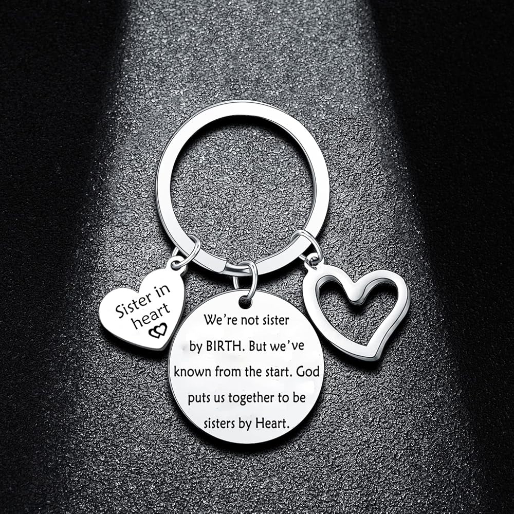 • The exquisite keychain Engraved with meaningful words "sister in heart. We're not Sisters by Birth But We've Known from the start. God put us together to be sisters by heart"A perfect jewelry gift keychain to sent your sister to let her know that she is so important and special to you.