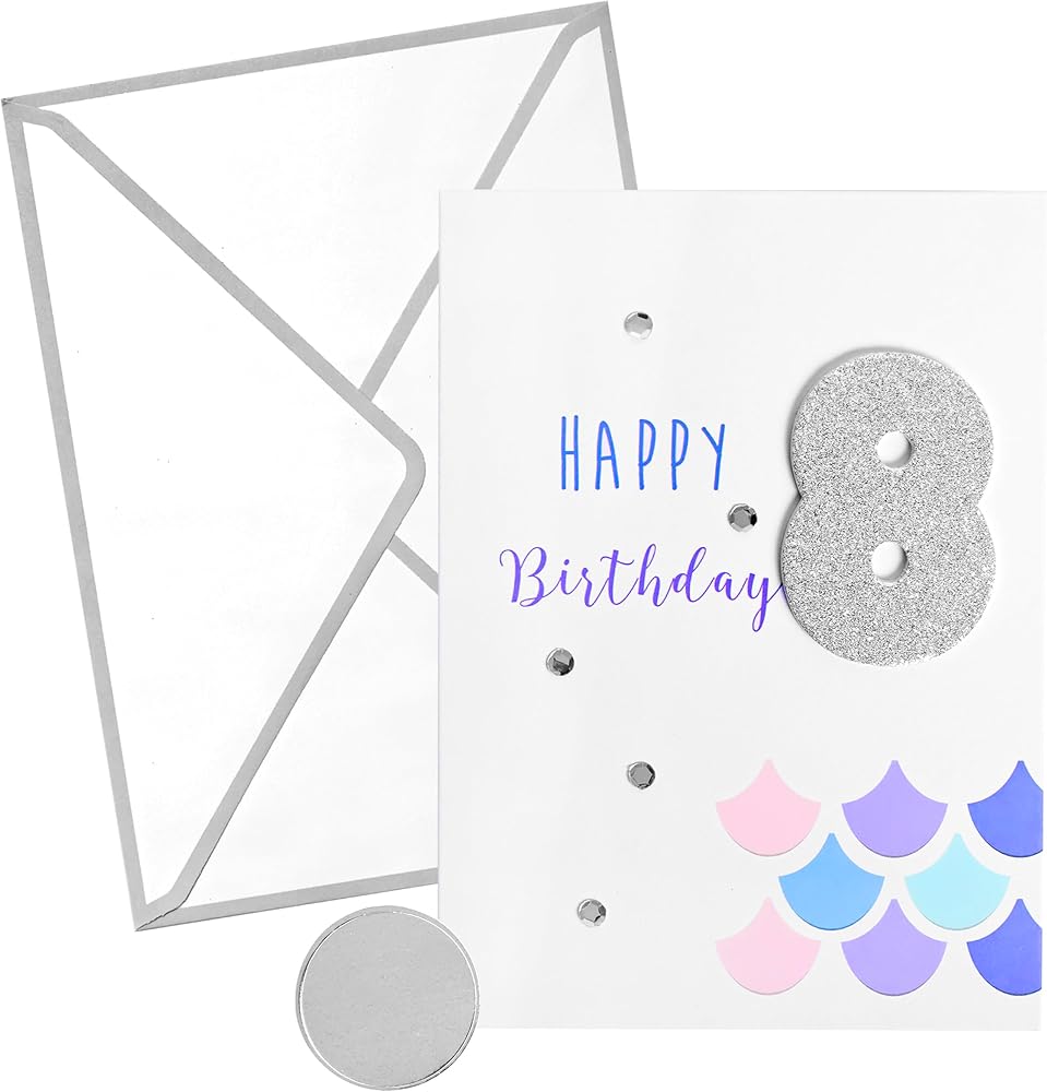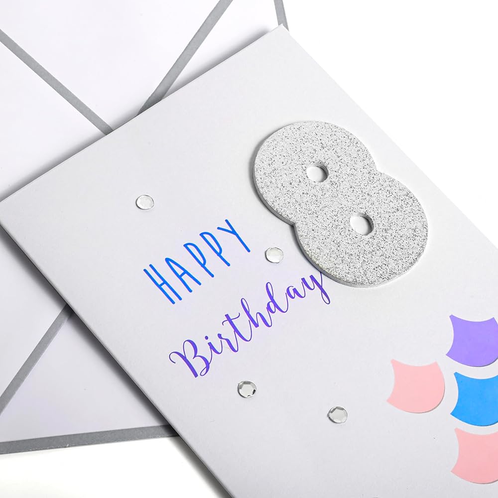 هدية GIGGLES بطاقة عيد الميلاد الثامن للفتاة | بطاقة حورية البحر للبنات - عيد ميلاد عمرها ثمان سنوات | حفيدة، ابنة أخت، ابنة، صديق | يأتي مع مغلف وختم متطابقين