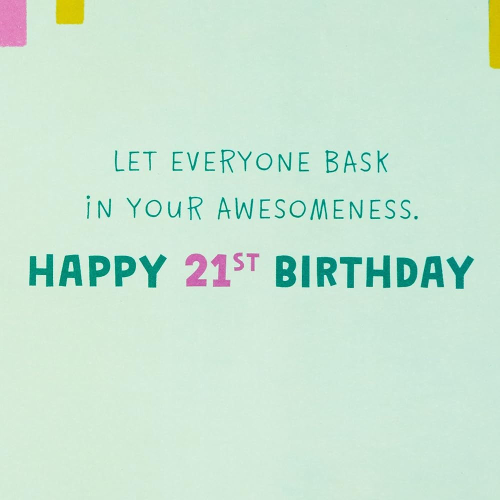 Inside reads: "Let everyone bask in your awesomeness. Happy 21st birthday."