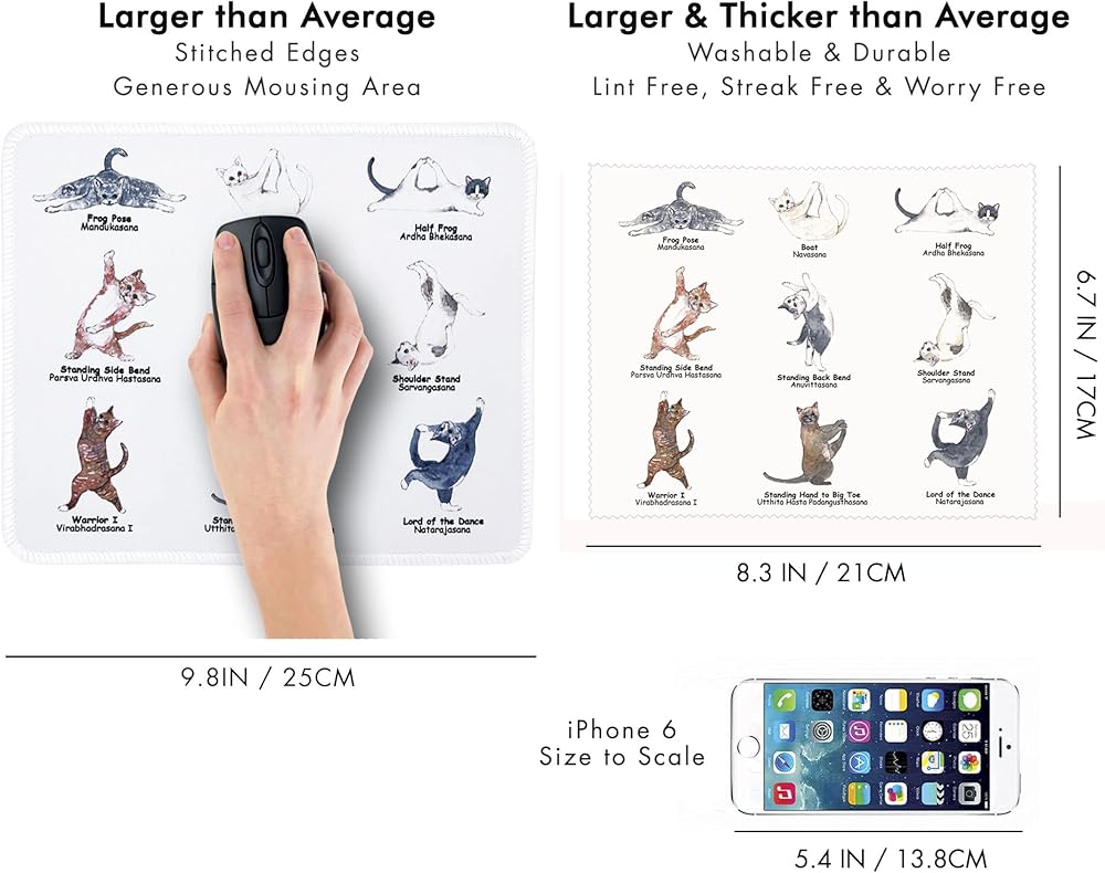 الحجم والمواد: لوحة الماوس، 9.9*8.3 بوصة (25*21 سم). سُمك لوحة الماوس 3 مم. قطعة قماش تنظيف كبيرة من الألياف الدقيقة فائقة النعومة، 8.5*6.5 بوصة (21*17 سم). سطح من الألياف الدقيقة فائقة النعومة ناعم على البشرة ويوفر متانة إضافية. دعم قاعدة مطاطية غير قابلة للانزلاق.