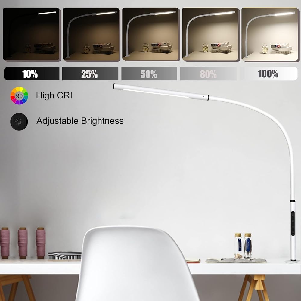 مصباح مكتب للعناية بالعين، مصباح معقوفة مع مشبك، ضوء مكتب بذراع متأرجح، سطوع قابل للتعديل ودرجات حرارة اللون، وظيفة الذاكرة والمؤقت، مشبك على مصباح مكتب للمكتب المنزلي، 12 وات، أبيض