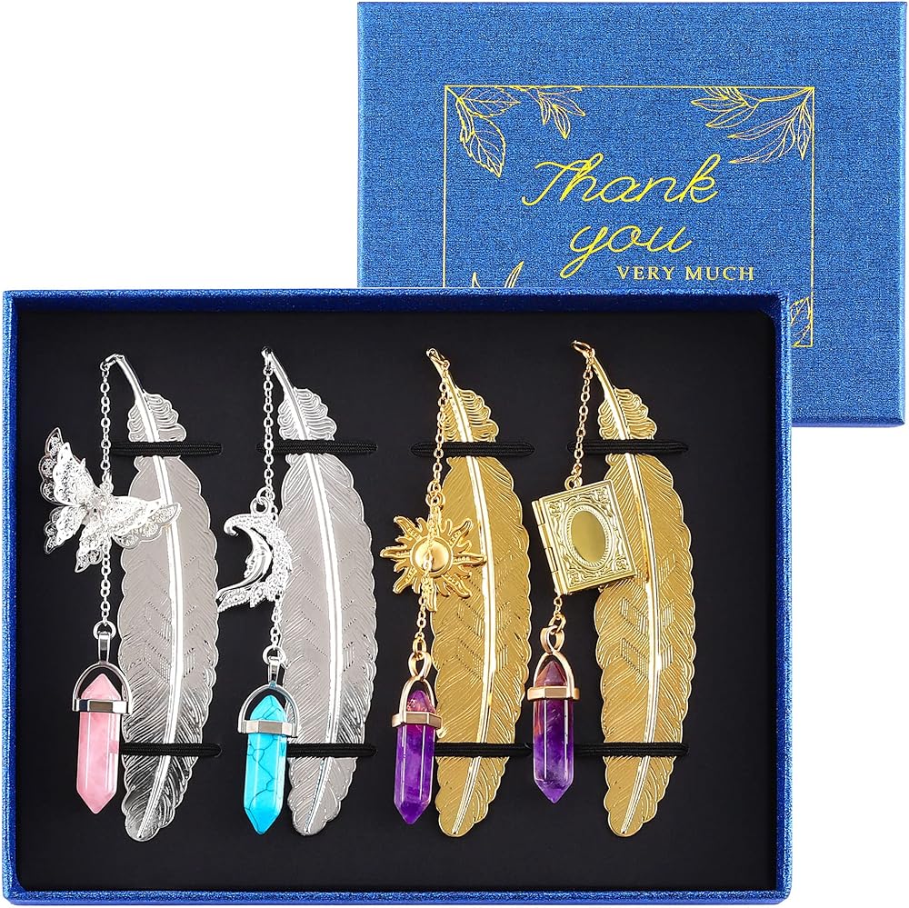 مجموعة الإشارات المرجعية المعدنية - 4 قطع من الإشارات المرجعية المعدنية ذات الريش العتيق مع قلادة كريستال على شكل فراشة، هدية تقدير المعلم، هدايا للنساء والفتيات قارئات الكتب، هدية عيد الحب للأمهات