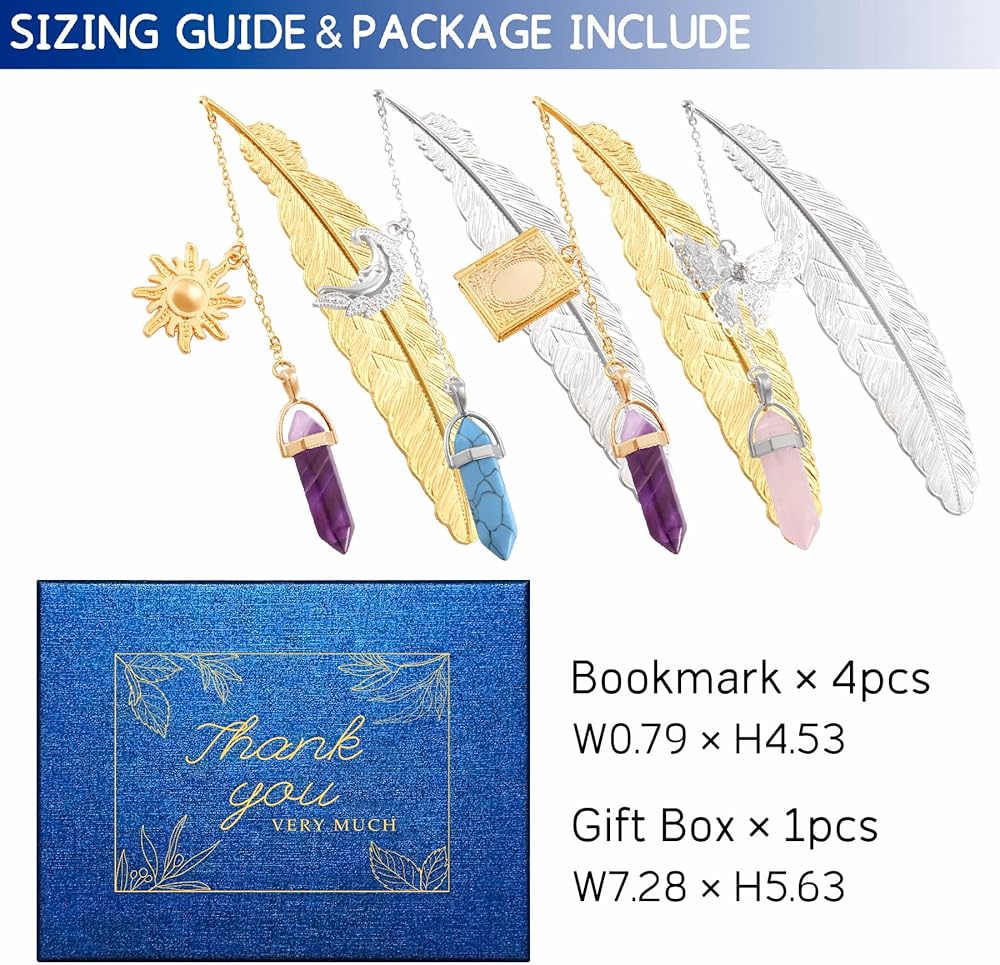 ☀️Unique Design - Include 4 pieces of different designs retro metal feather bookmarks, with beautiful sun and natural amethyst pendant, stimulate reading motivation and make you love it.