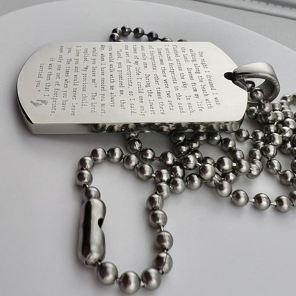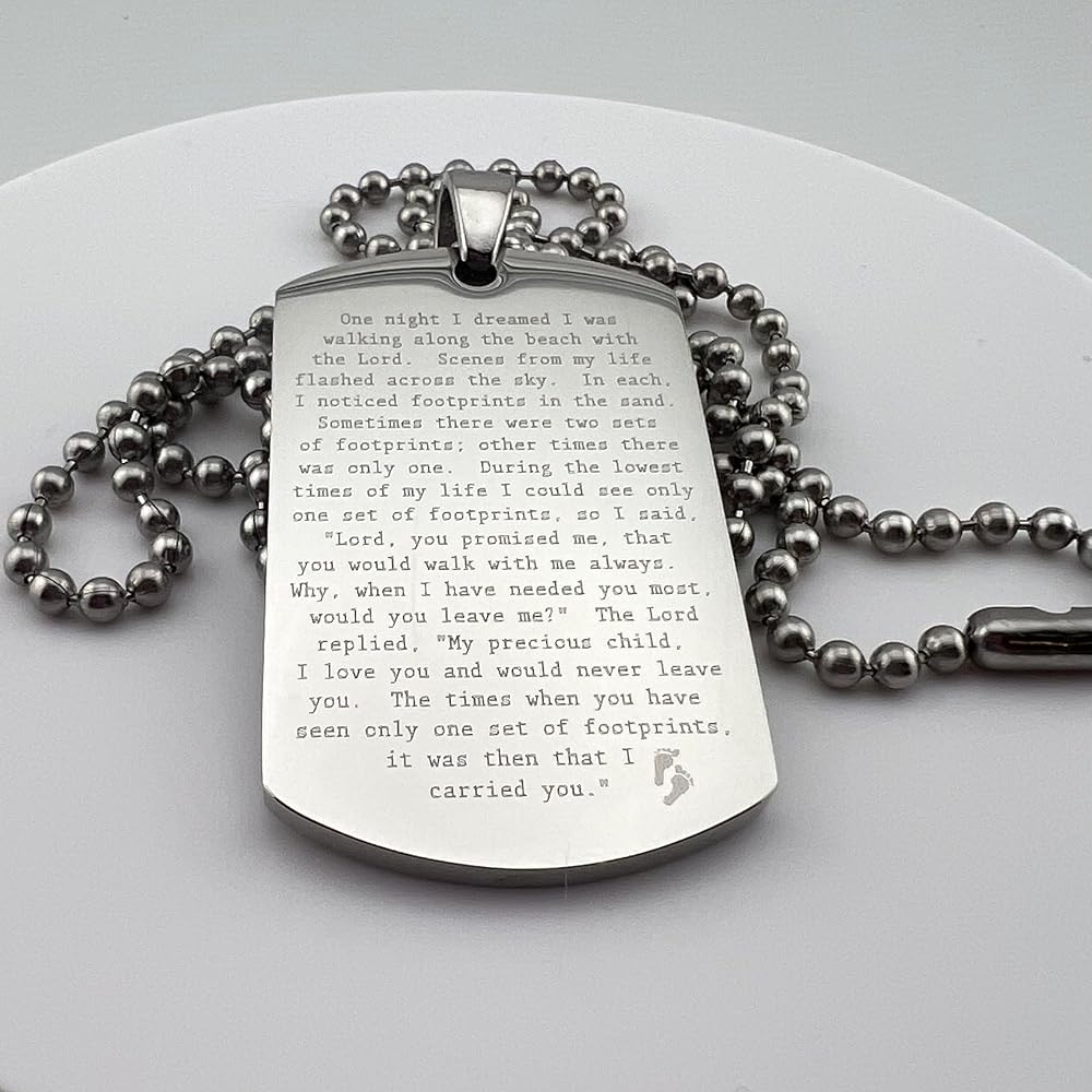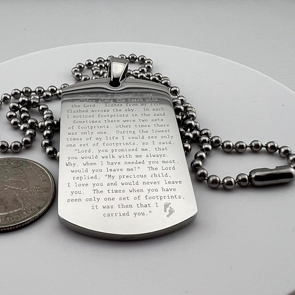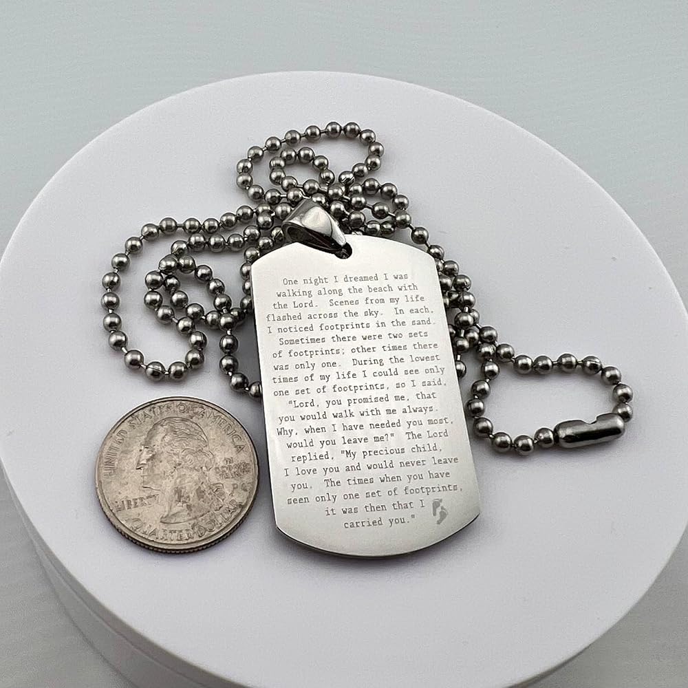 FOOTPRINTS IN THE SAND PRAYER SOLID THICK STAINLESS STEEL SHINE CROSS PRAYER Beautiful message. Footprints poem. Item is solid stainless steel Pendant is 30x50mm 2.7mm thick Ball chain is 30" long, 3.2mm ball diameter. As with all of our items, the image is engraved permanently into the surface of the pendant, will not wash or wear off. Color is natural highly polished stainless steel. Stainless steel is the perfect choice for long life items to be cherished and treasured. On Oct-13-16 at 15:40:01 PDT, seller added the following information: