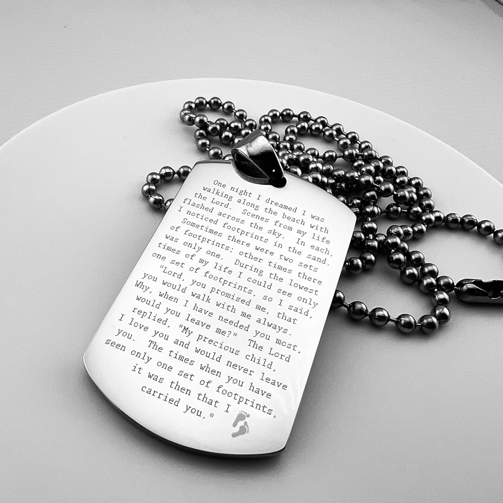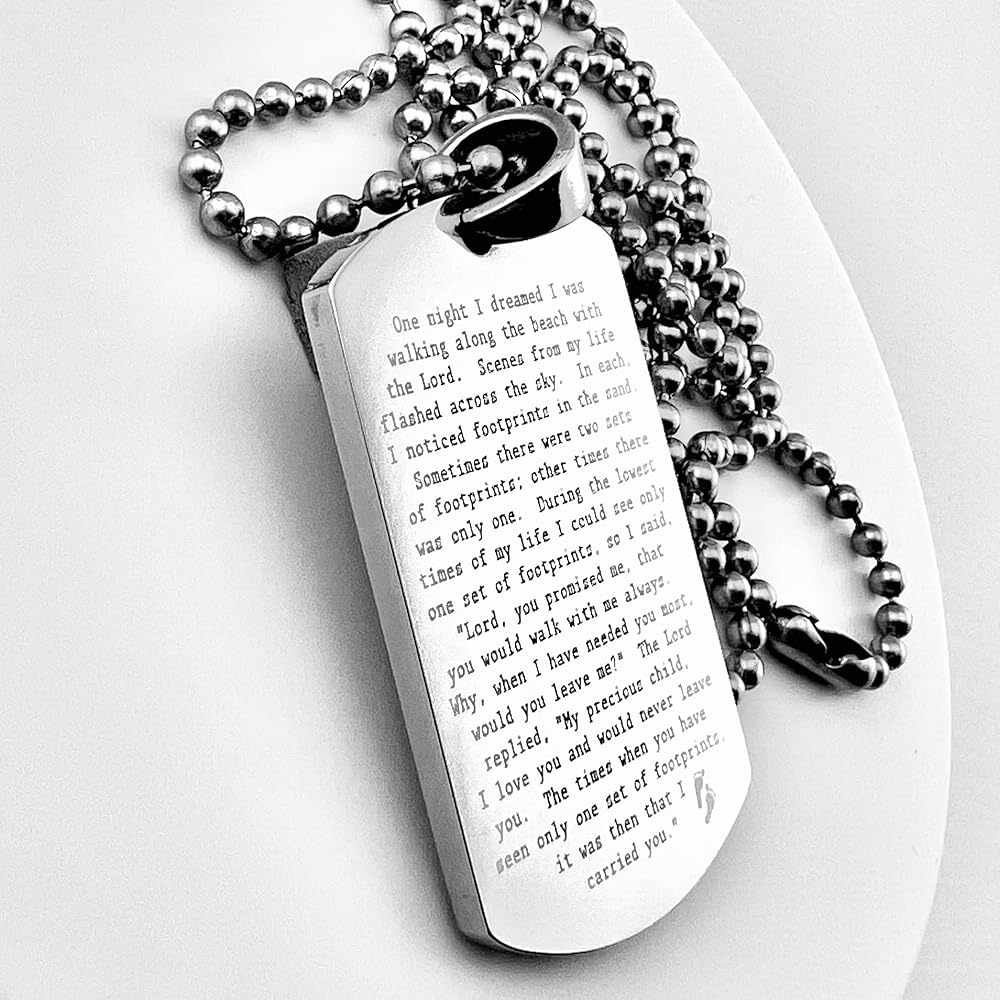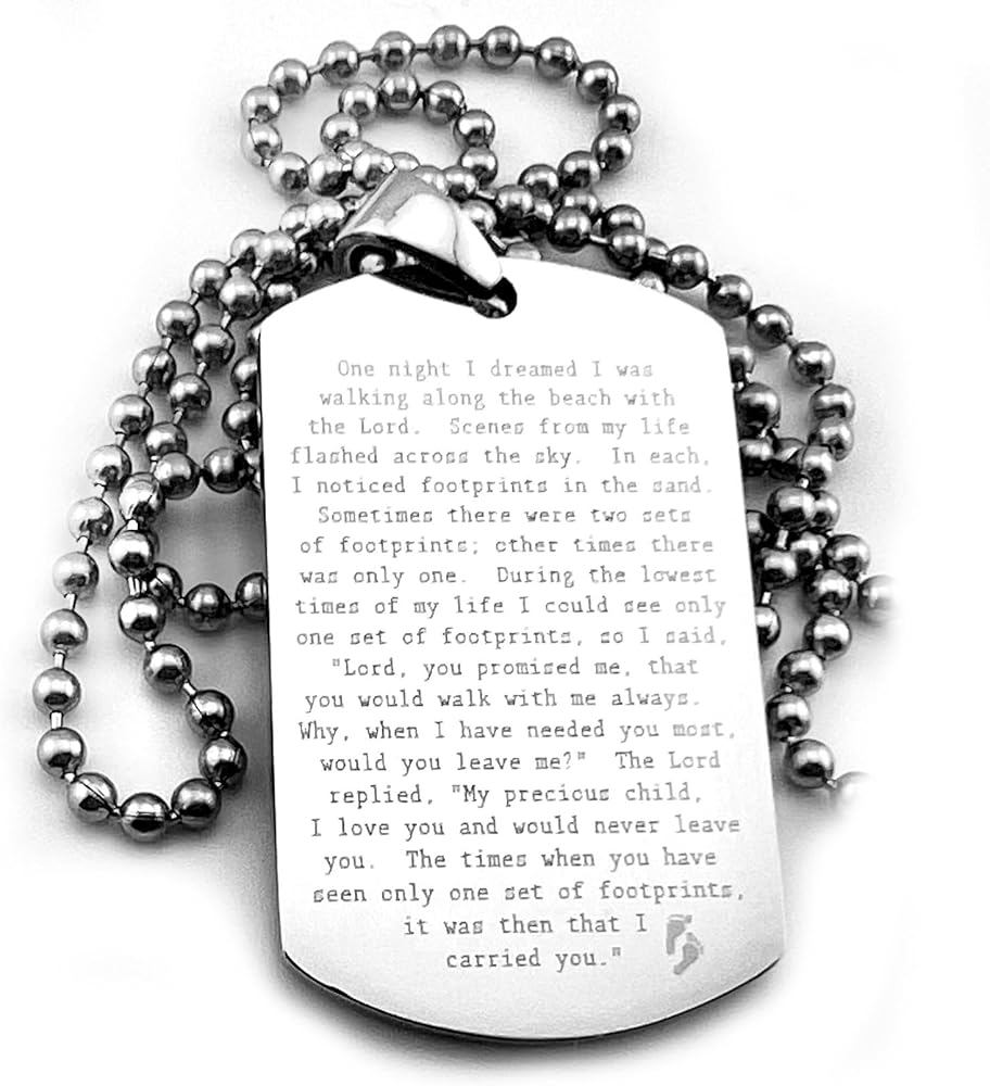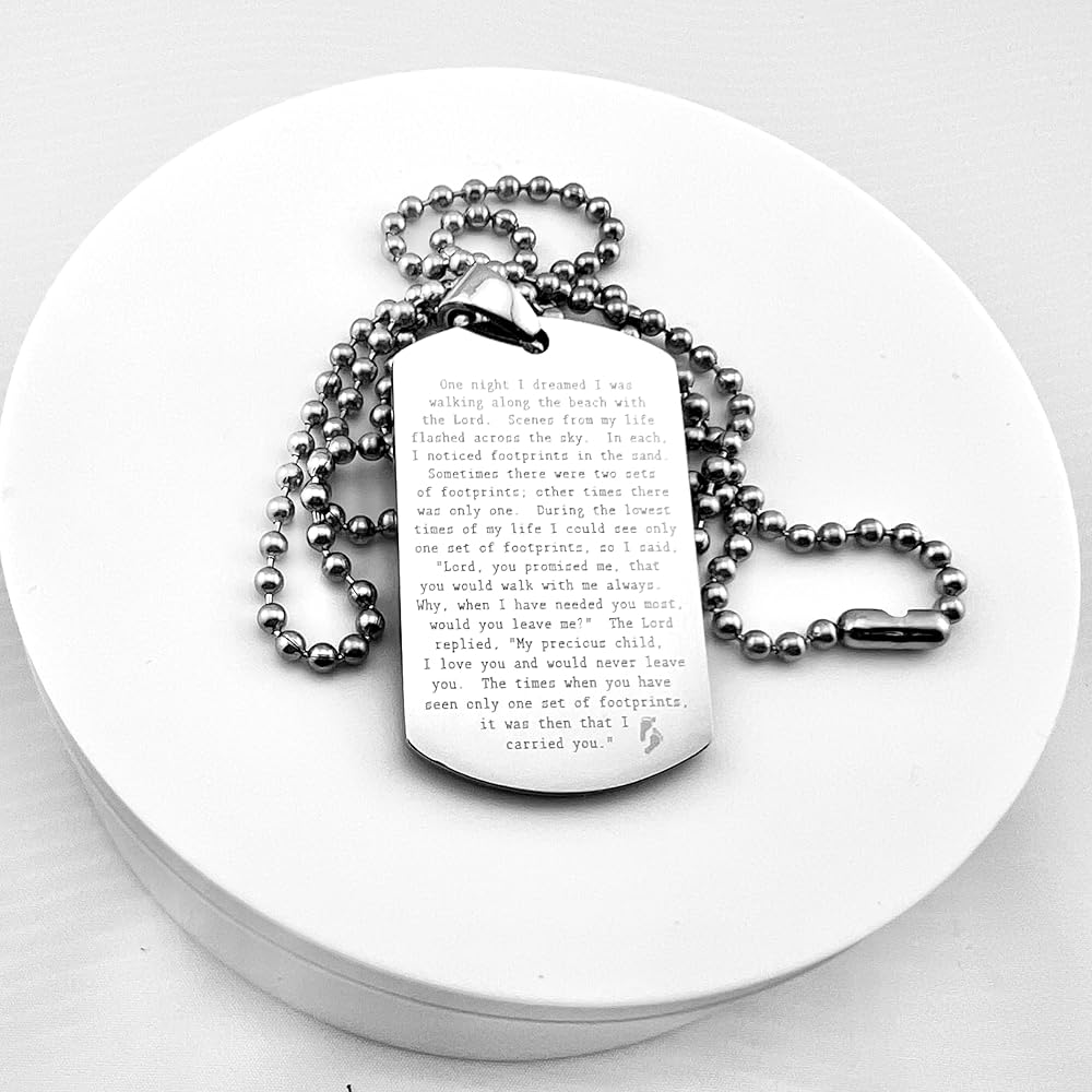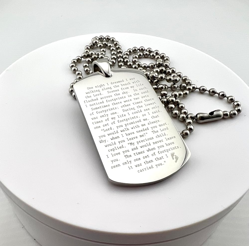 FOOTPRINTS IN THE SAND PRAYER SOLID THICK STAINLESS STEEL SHINE CROSS PRAYER Beautiful message. Footprints poem. Item is solid stainless steel Pendant is 30x50mm 2.7mm thick Ball chain is 30" long, 3.2mm ball diameter. As with all of our items, the image is engraved permanently into the surface of the pendant, will not wash or wear off. Color is natural highly polished stainless steel. Stainless steel is the perfect choice for long life items to be cherished and treasured. On Oct-13-16 at 15:40:01 PDT, seller added the following information: