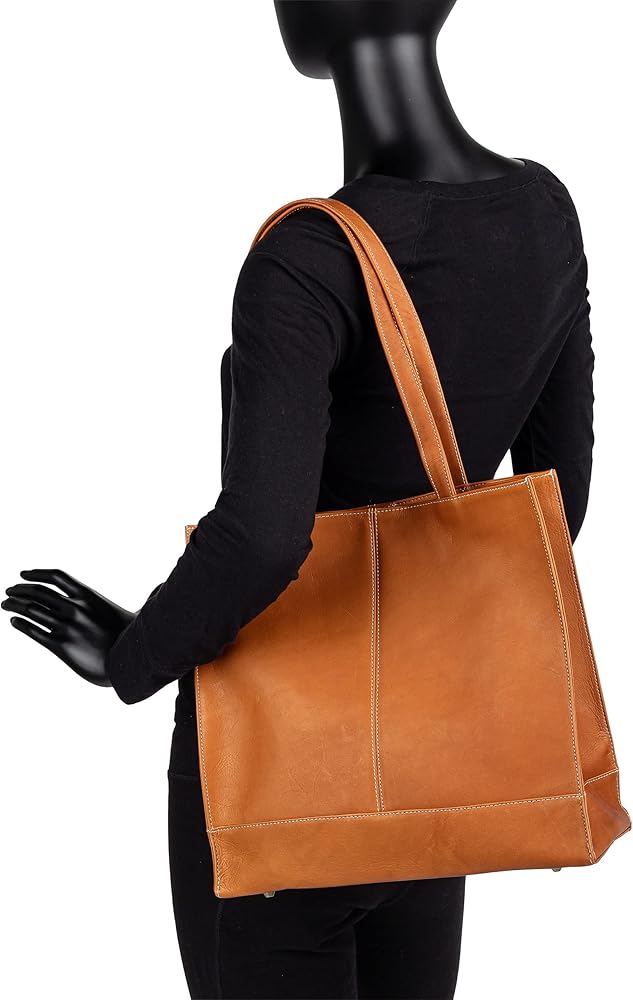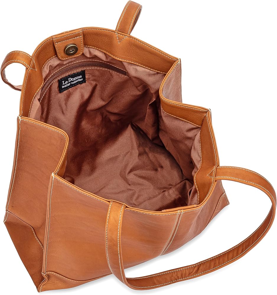The Le Donne Leather Everly Tote combines practical storage space and organization with sophisticated style. This well-designed tote is sure to become your go-to bag for work, travel and everyday errands. It features lovely contrast stitching and a sleek, simple silhouette made from premium leather. Four metal feet on the bottom help the Everly tote stand upright and avoid damage when setting it down on flat surfaces. Premium full-grain Colombian Vaquetta leather Handcrafted by skilled Colombian craftsmen Antique-style hardware Magnetic snap closure Lined interior One zip and two slip interior pockets Dual tote strap Four metal feet Strap lengths: 23” Drop length: 11” Dimensions: 12.5” x 12.5” x 5” Weight: 1.6 lbs.