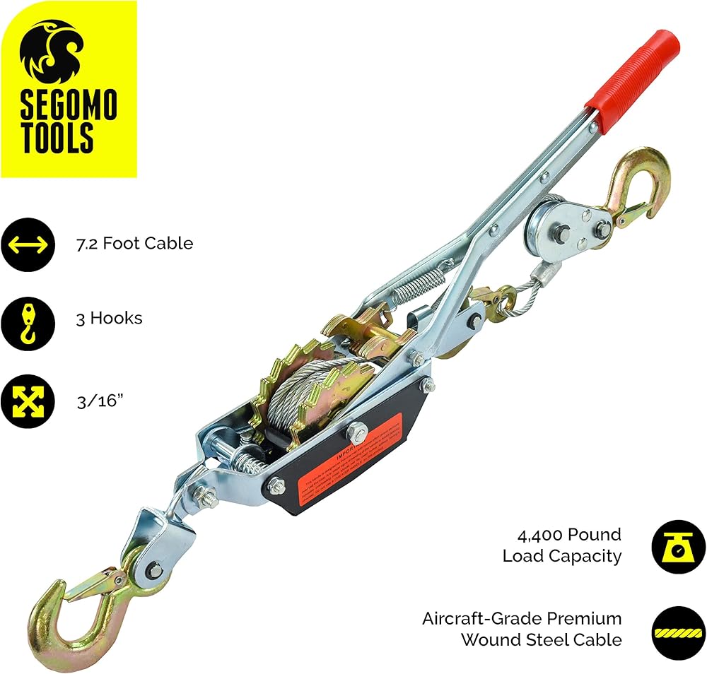 [ Big Pulling Capacity ] Our come-along tool has 7.2 foot (3 hook) 3/16 inch aircraft-grade wound steel premium cable with a 4,400 pound load capacity.