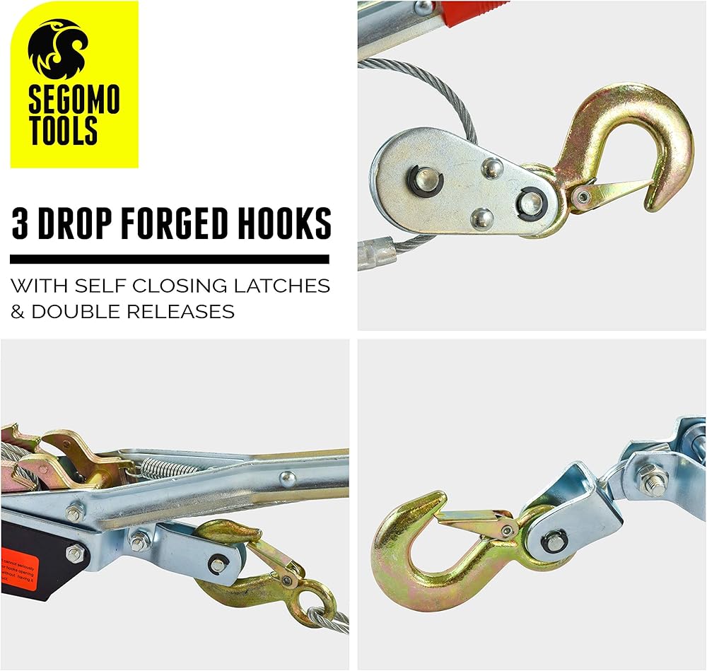 [ Safe and Durable Design ] This rope come along puller has hardened all-steel construction with corrosion & rust resistant galvanized finish. The cable winch puller features 3 drop forge hooks with self closing safety latches and double releases for sure connection and safety.