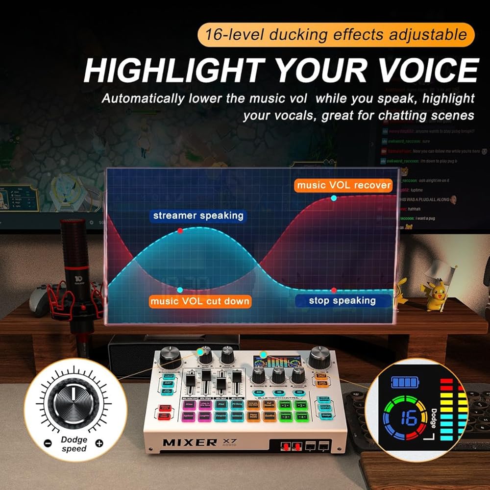 • [تقليل الضوضاء بـ 16 مستوى وتأثير البطط بـ 16 مستوى] - 16 مستوى لتقليل الضوضاء قابل للتعديل، تتيح لك حزمة معدات البودكاست تصفية الضوضاء المختلفة بذكاء، وتجربة تسجيل فائق الوضوح. 16 مستوى مدمج لتأثيرات التخفيض التلقائي لمزيد من مشاهد الدردشة، سيقوم خلاط البودكاست تلقائيًا بخفض مستوى صوت الموسيقى الخلفية وتسليط الضوء على غناءك، للبث المباشر والراديو ودي جي وصوت اللعبة وما إلى ذلك مشاهد الدردشة.
