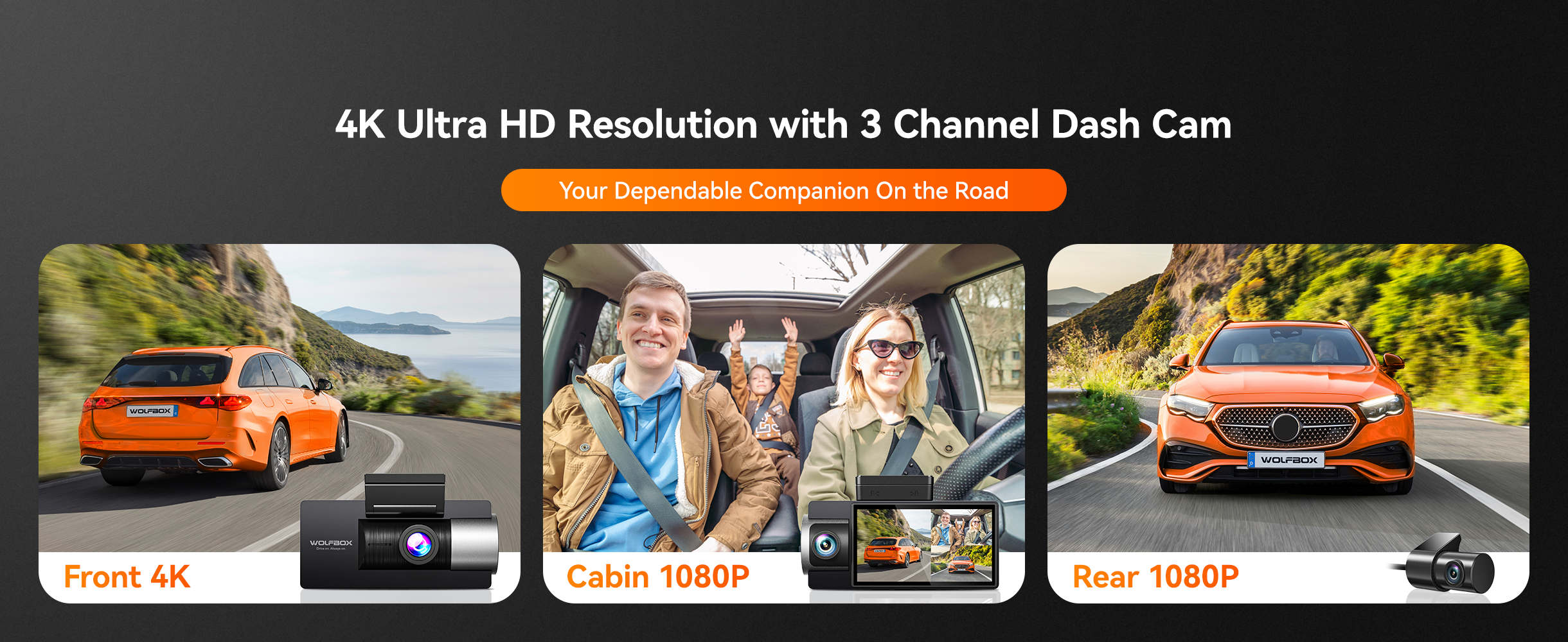 WOLFBOX 4K 3 Channel Dash Cam مدمج 5G WiFi GPS، 4K+1080P+1080P أمامي وخلفي من الداخل، بطاقة مجانية سعة 64 جيجابايت، كاميرا سيارة ثلاثية مع شاشة 3 بوصة، رؤية ليلية بالأشعة تحت الحمراء، مستشعر G، وضع انتظار السيارات على مدار 24 ساعة