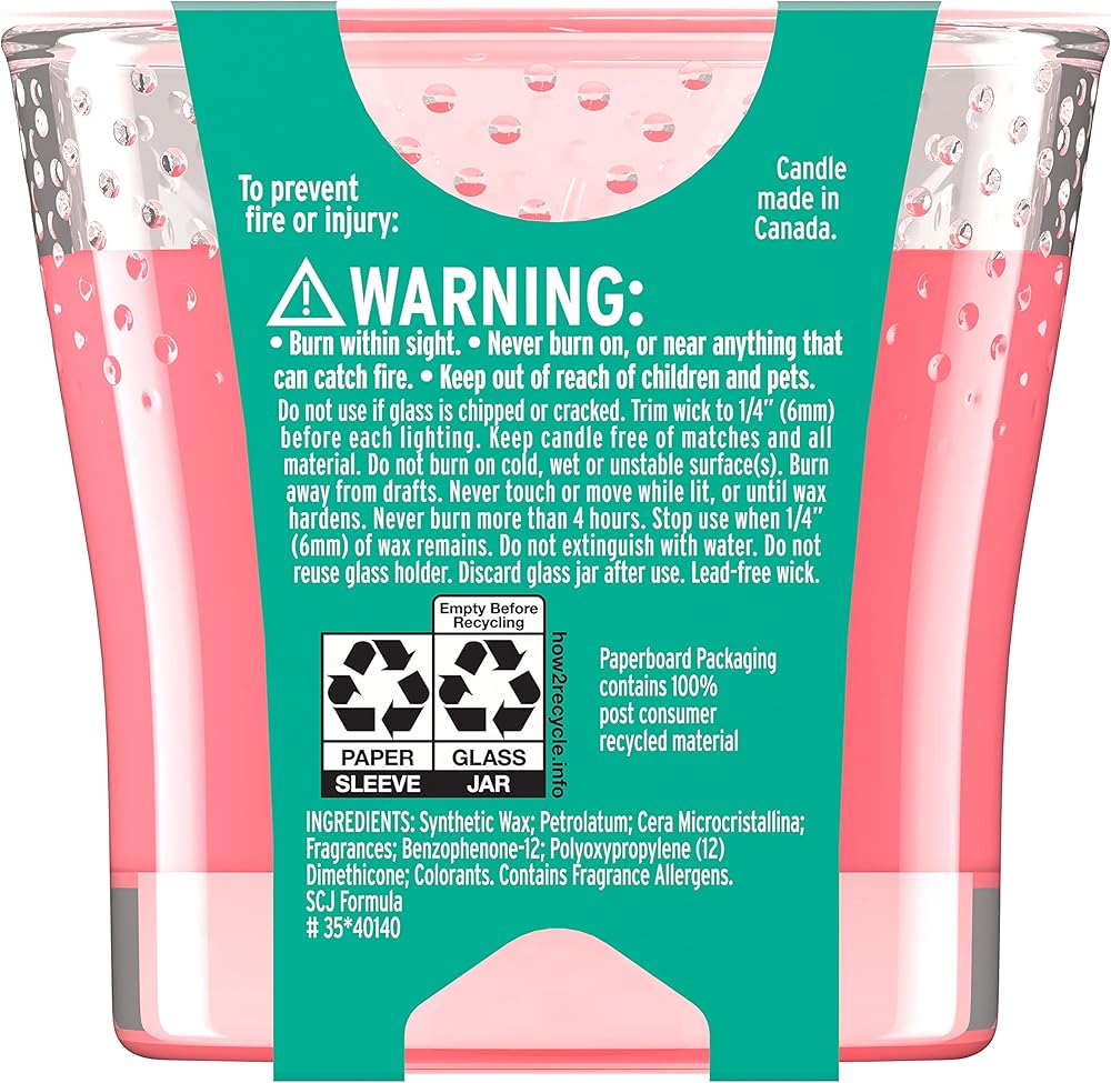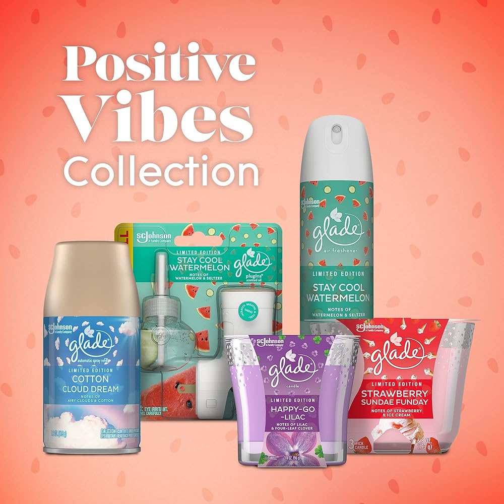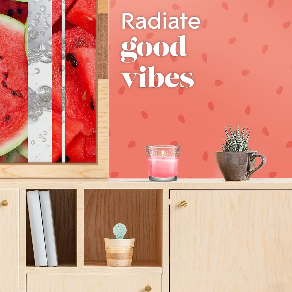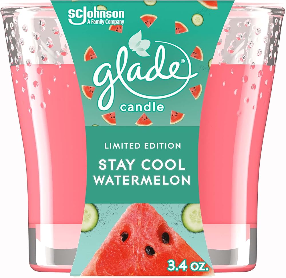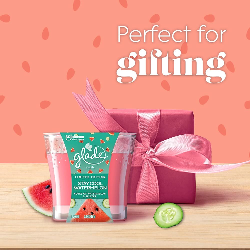Create a special mood and radiate good vibes with the Glade Stay Cool Watermelon jar candle. It's part of our Limited Edition Positive Vibes Collection, specially designed to help you unlock the vibes of the spring season. These small jar candles have been expertly crafted by our master perfumers. With fragrance infused with essential oils and feel-good ingredients, they have sparkling and fruity notes of juicy watermelon, cool cucumber and bubbly seltzer. Just light up one of these fragrant candles and boost the mood with Stay Cool Watermelon. They're masterfully designed glass jar candles that fill the room with superior scent and glow. It's a pretty way to unlock the feeling of spring. Plus, the good vibes keep going – these small scented candles are made without parabens, phthalates or formaldehydes. To find your vibe, check out the entire Limited Edition Positive Vibes Collection. If you're looking for an easy way to brighten up your day, a fragrant candle is an excellent choice, and we've got one to match your mood. So go ahead, turn up the good vibes and create an air of spring in any space with a Stay Cool Watermelon scented candle. Candle burning tips: For best performance, burn two to four hours at a time. This will maximize the life of your candle. Trim the wick to 1/4 inch each time before you burn, and be sure to remove any wick debris in the candle before lighting. Do not touch, lift or move a burning candle. Wait until the wax has cooled and hardened before touching a candle. For optimal performance, keep burning candles away from drafts, vents and air currents. Stop using your Glade Jar Candle when 1/4 inch of wax remains. Be sure the candle jar is placed on a stable, heat-resistant surface. Never place flammable materials near a candle. Never burn candles unattended. Do not burn candles where they can be knocked over by children, pets or anyone else.
