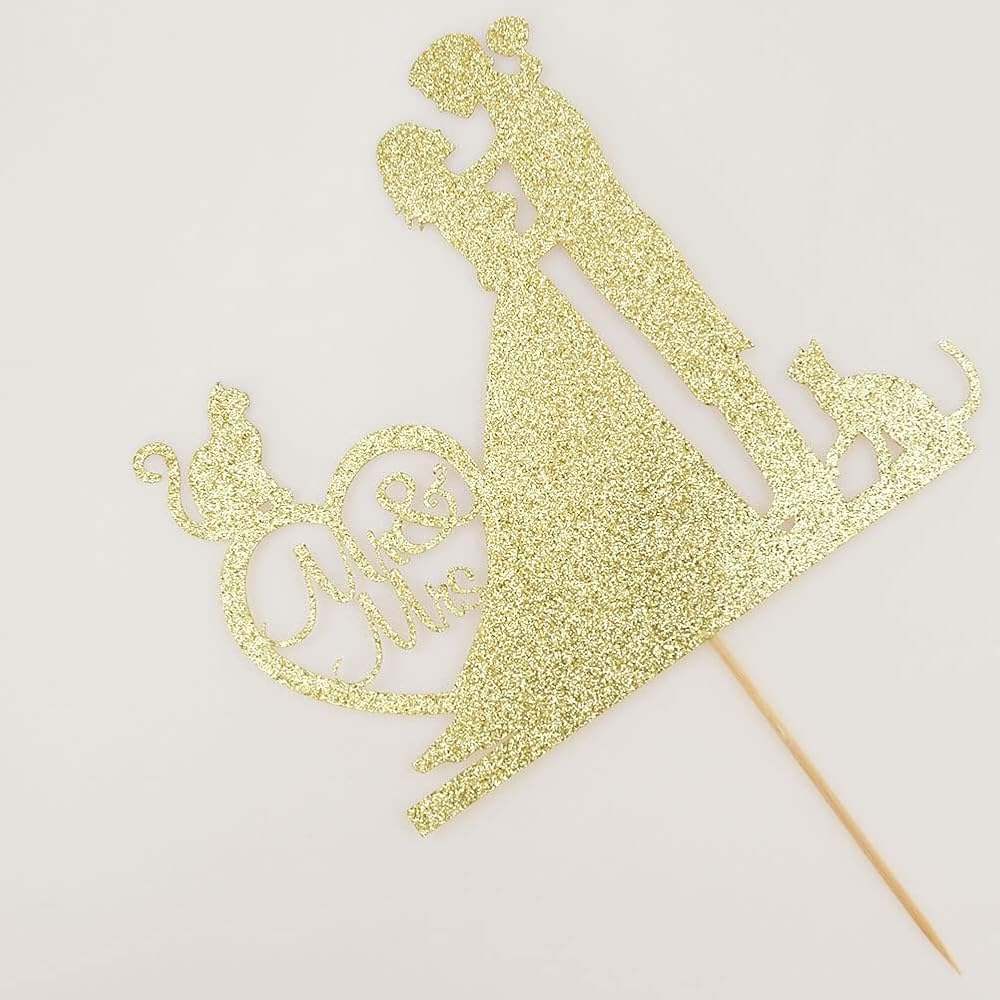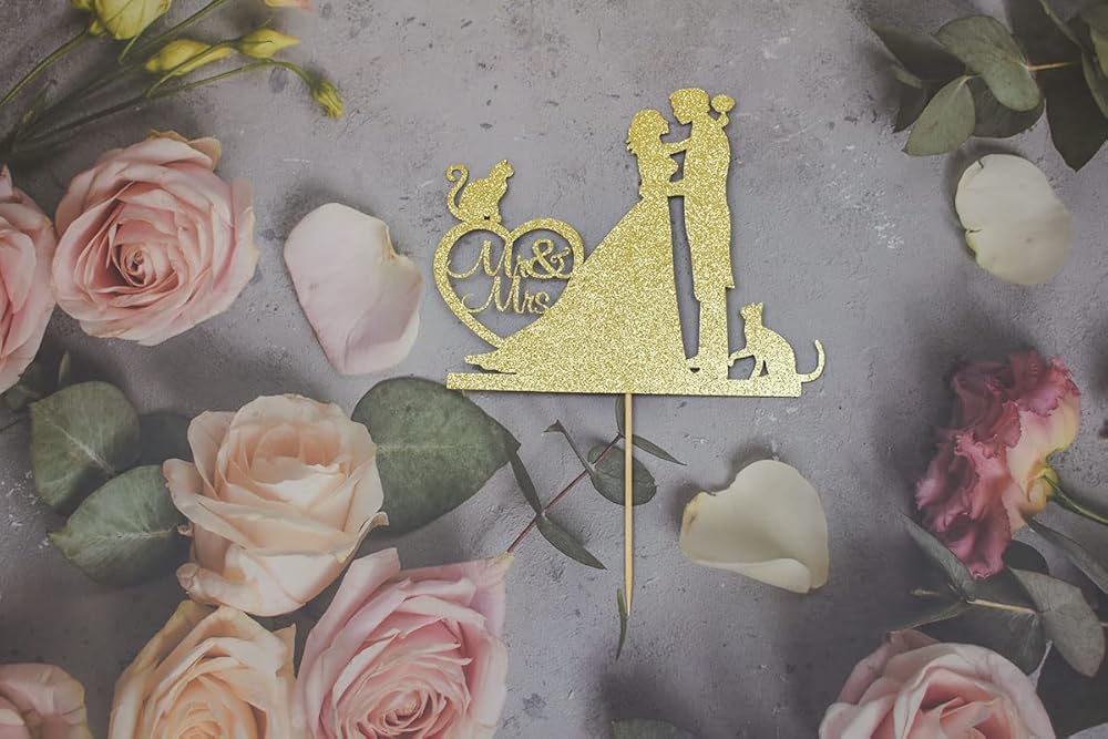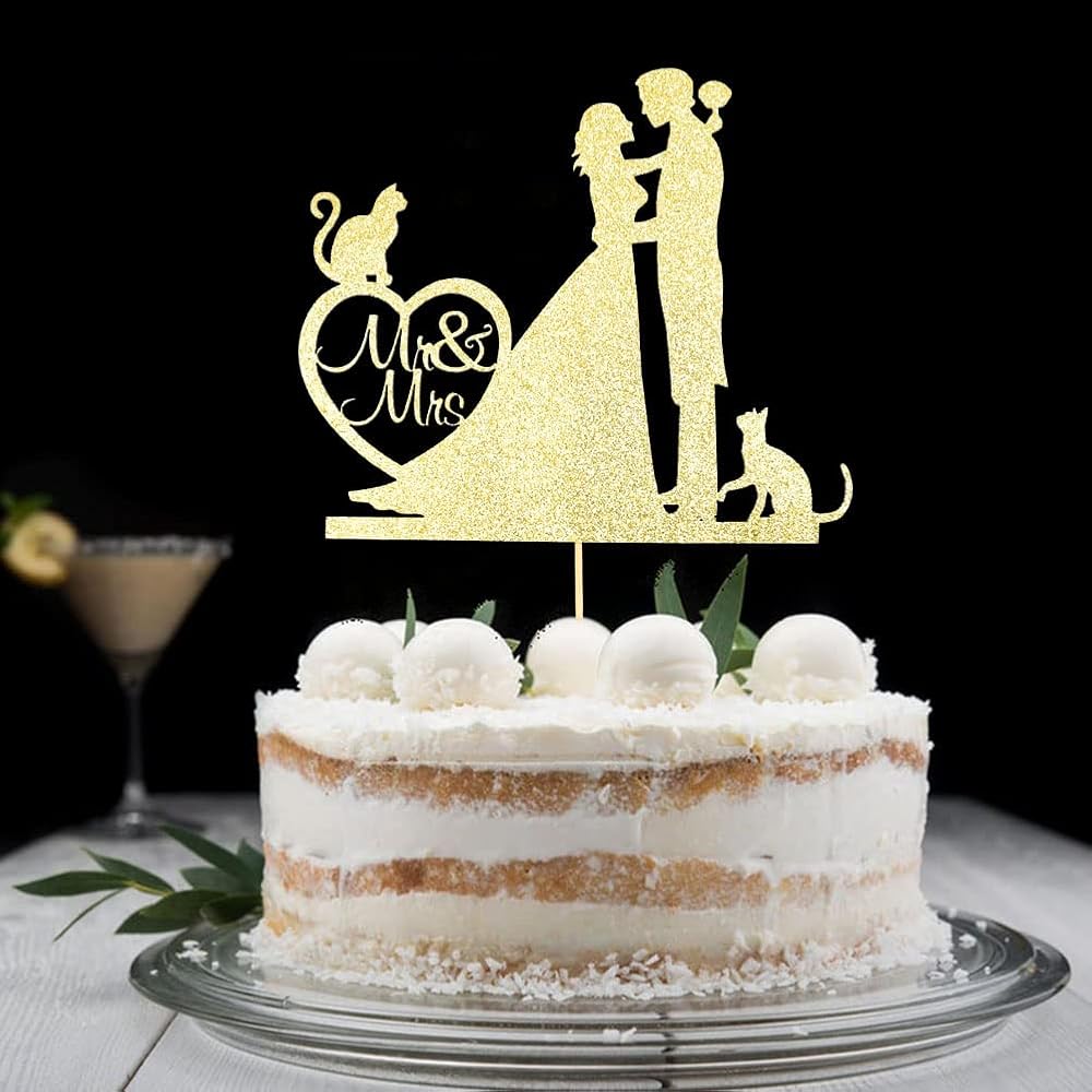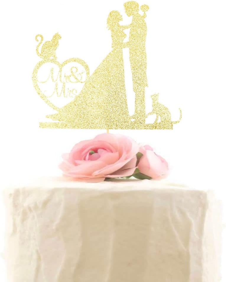 غلاف كعكة السيد والسيدة، العروس والعريس مع القطط صورة ظلية لتزيين كعكة الزفاف، زينة حفلات الحيوانات الأليفة للقطط، ذهبي لامع