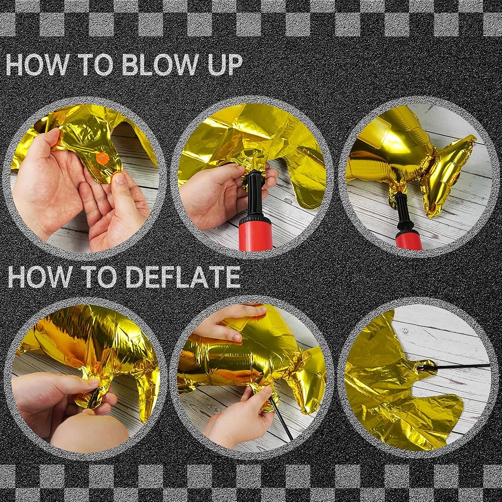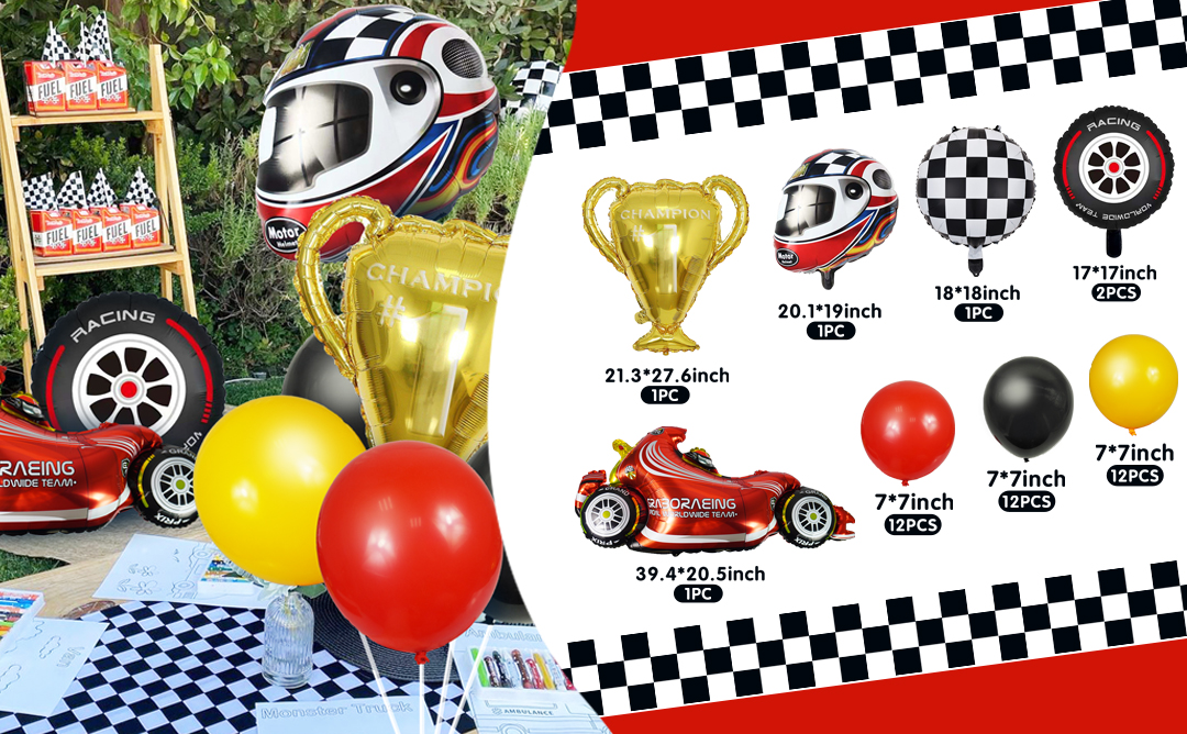 • المواد: بالونات اللاتكس مصنوعة من مواد عالية الجودة. بالونات موضوع السباق مصنوعة من فيلم الألومنيوم. هذه البالونات ليس من السهل كسرها ويمكن إعادة استخدامها.