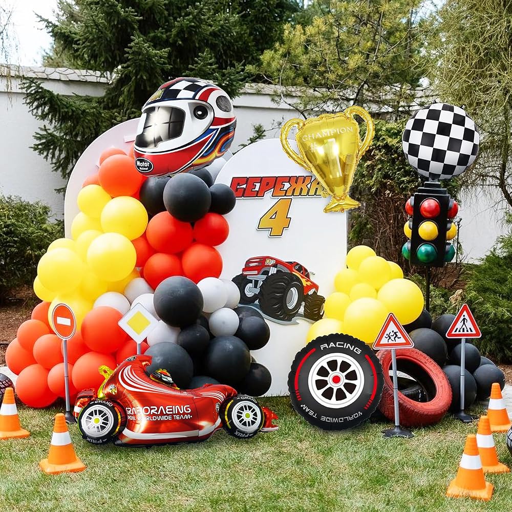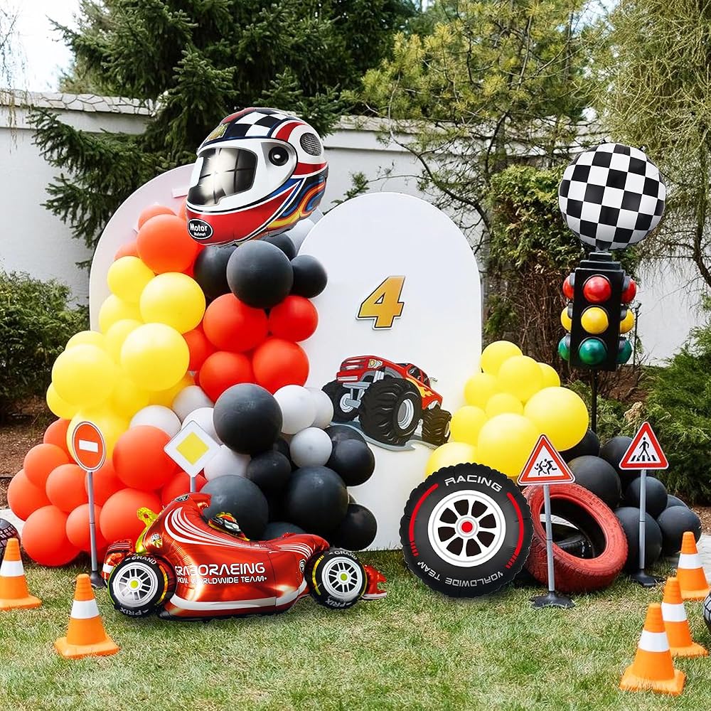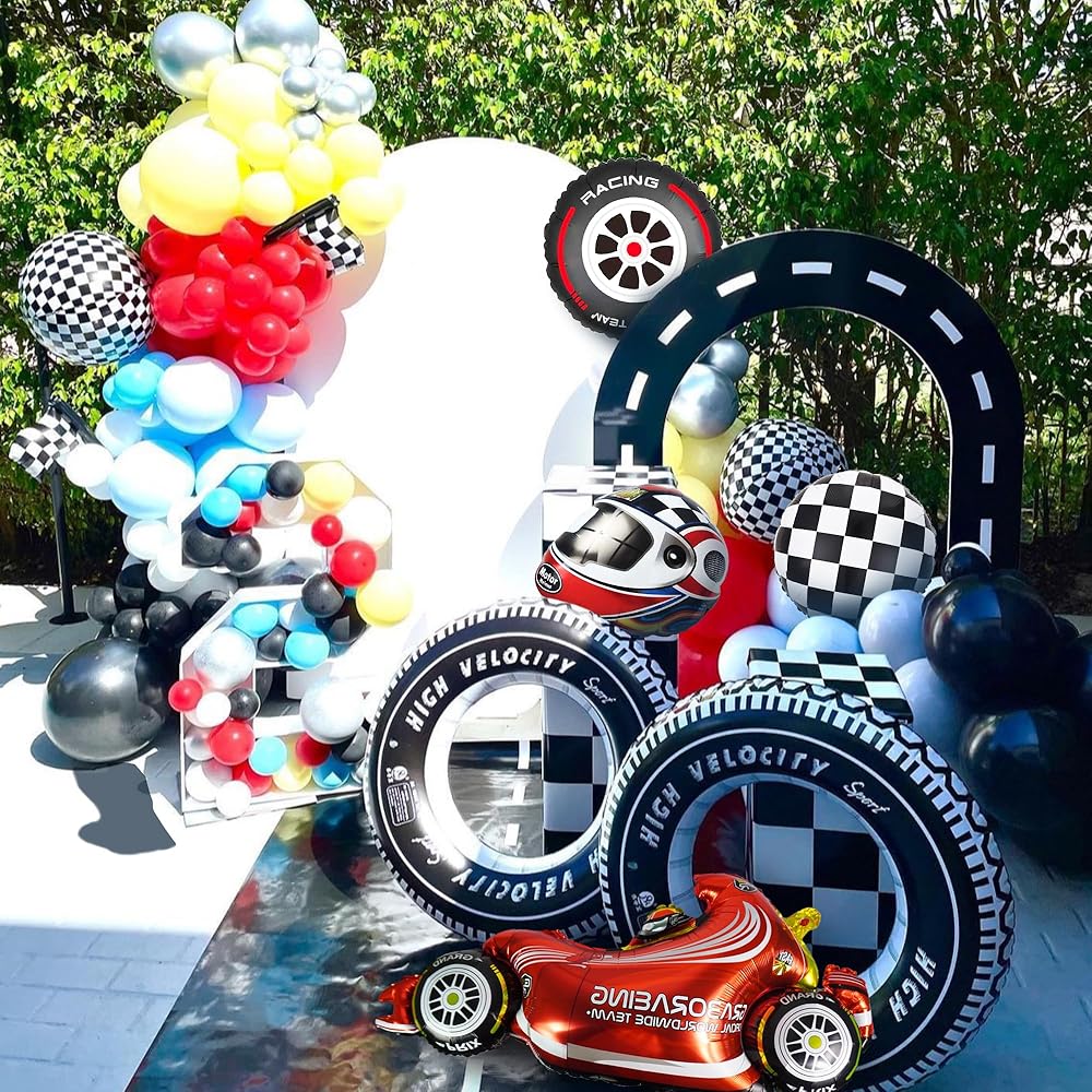 بالونات سباق السيارات، زينة حفلات سباق السيارات، خوذات الإطارات، بالونات المتسابق للرجل والصبي والأطفال، حفلة سباق السيارات، زينة عيد ميلاد سريعة، لوازم استحمام الطفل (سباق 1)