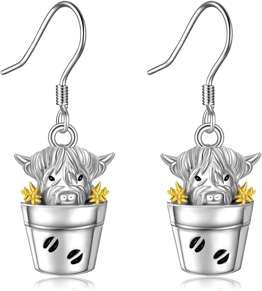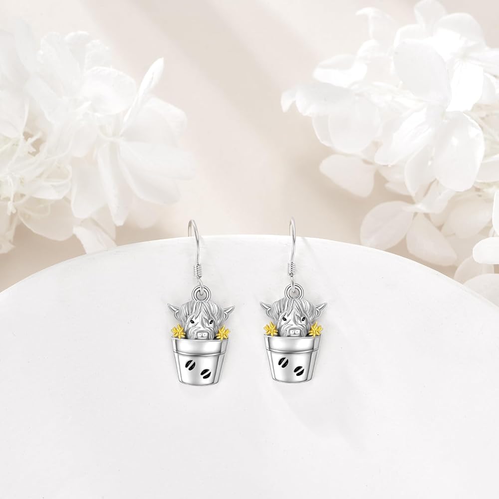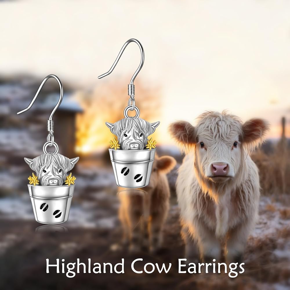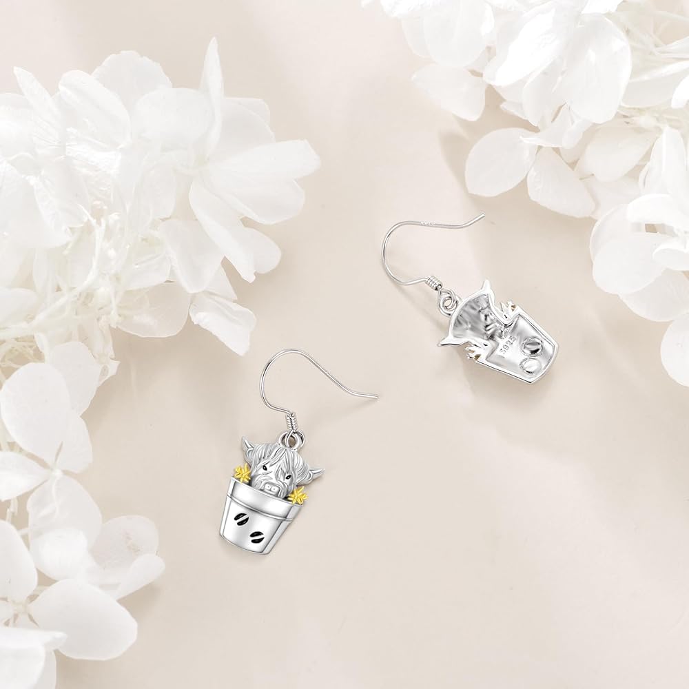 SILBAZ Highland Cow Dangle Earrings 925 Sterling Silver Highland Cow Drop Earrings Highland Cow Jewelry for Women Gifts for Mother Mom