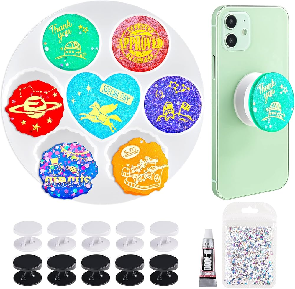 NiArt Phone Grip On Top Epoxy Resin Casting Kit 7 Mix Shapes Silicone Molds+10 Expandable Stand Bases+Glue+Star Sequins, DIY Holder Socket Art Craft Keychain Jewelry Pendant Making Supplies UV Plaster