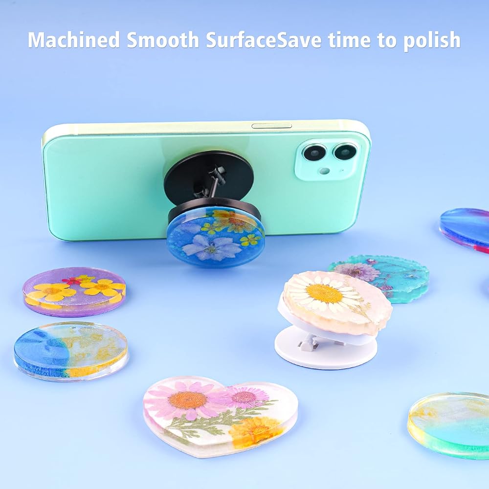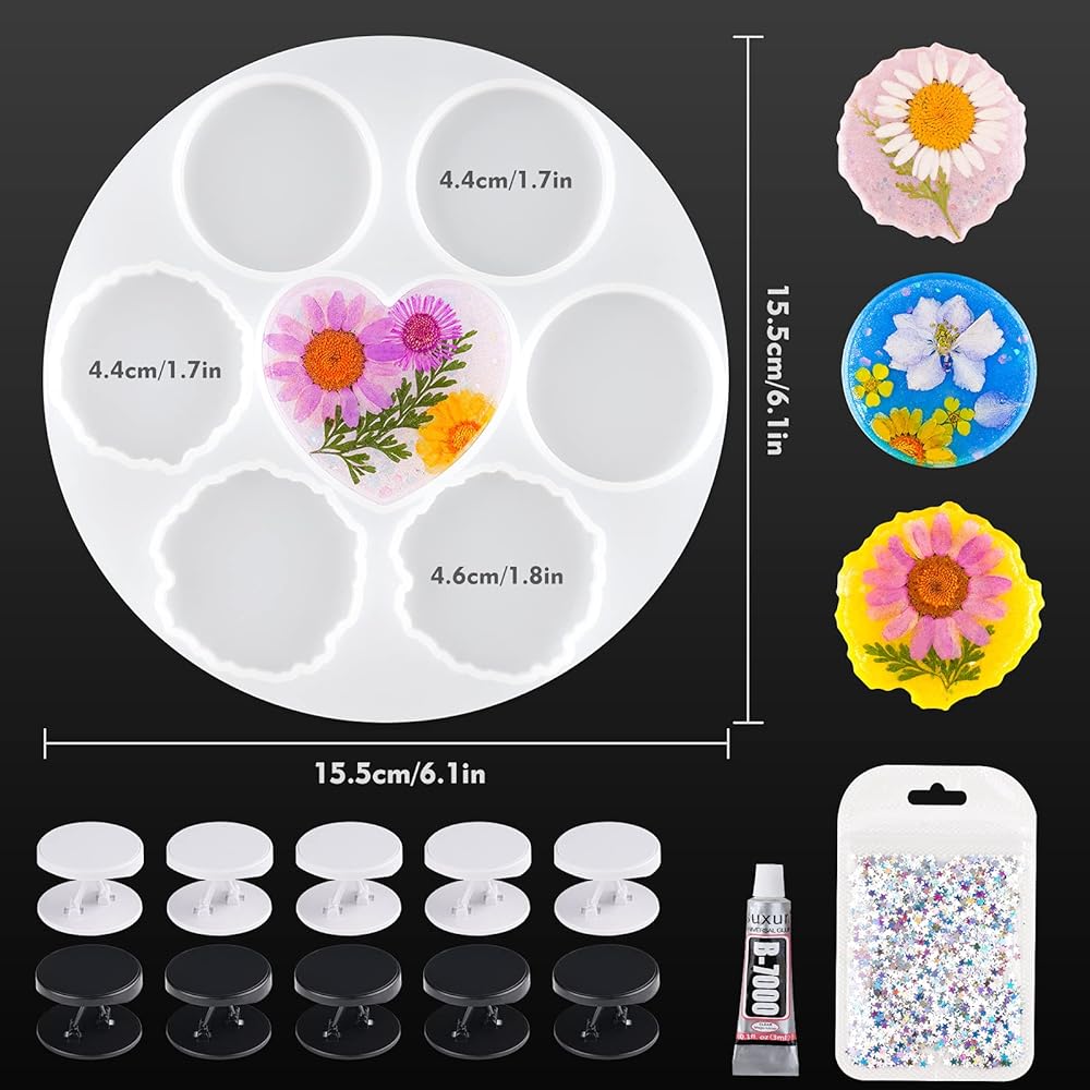 🌺【Phone Grip Mold Kit】Includes 1x (6.5”x6.5”) 7-cavity tray mold with assorted shapes, 1x 0.1 fl. oz universal glue, 10x phone stand bases (5 black+5 white) and 1x delicate silver star laser sequins pack. Molds are compatible with PopSocket and great for making key chains, pendants, jewelry and more. Convenient to make several pieces at the same time and it's a great tool for all craft lovers to make one-of-a-kind gifts for friends and family.