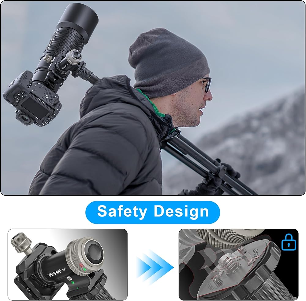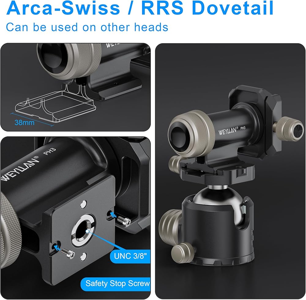 • Integrated Arca-swiss dovetails on base, comes with safety stop screws for use with other QR clamps. 3/8'' threaded hole compatible with tripods, monopods.