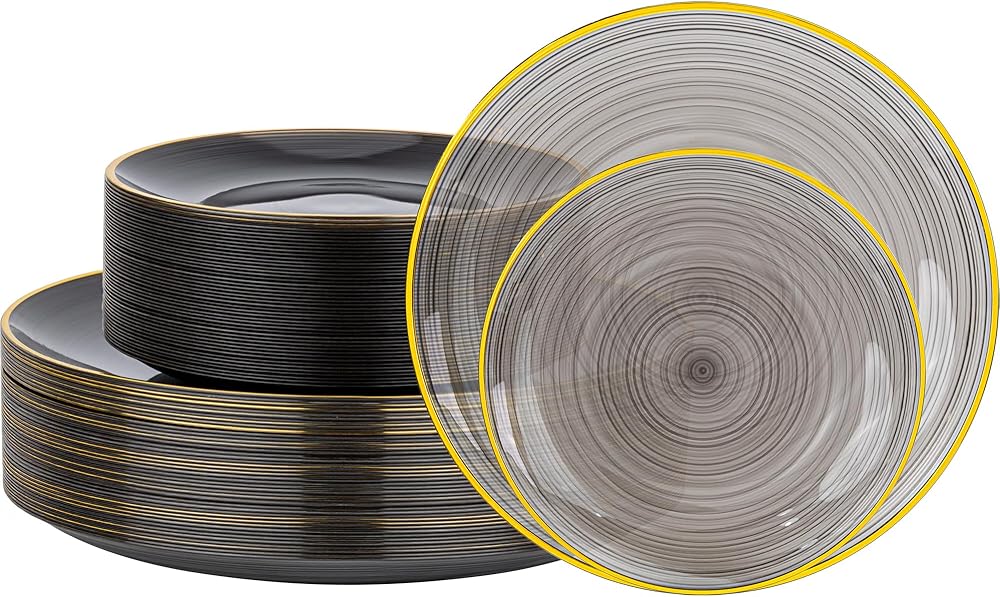 أطباق بلاستيكية سوداء 100 قطعة من Morejoy، أطباق سوداء للاستعمال مرة واحدة مع حافة ذهبية، لوحة ذهبية شديدة التحمل، لوحة تصميم دوامة حديثة تتضمن 50 طبق حلوى شفاف، 50 طبق عشاء للحفلات، رأس السنة الجديدة