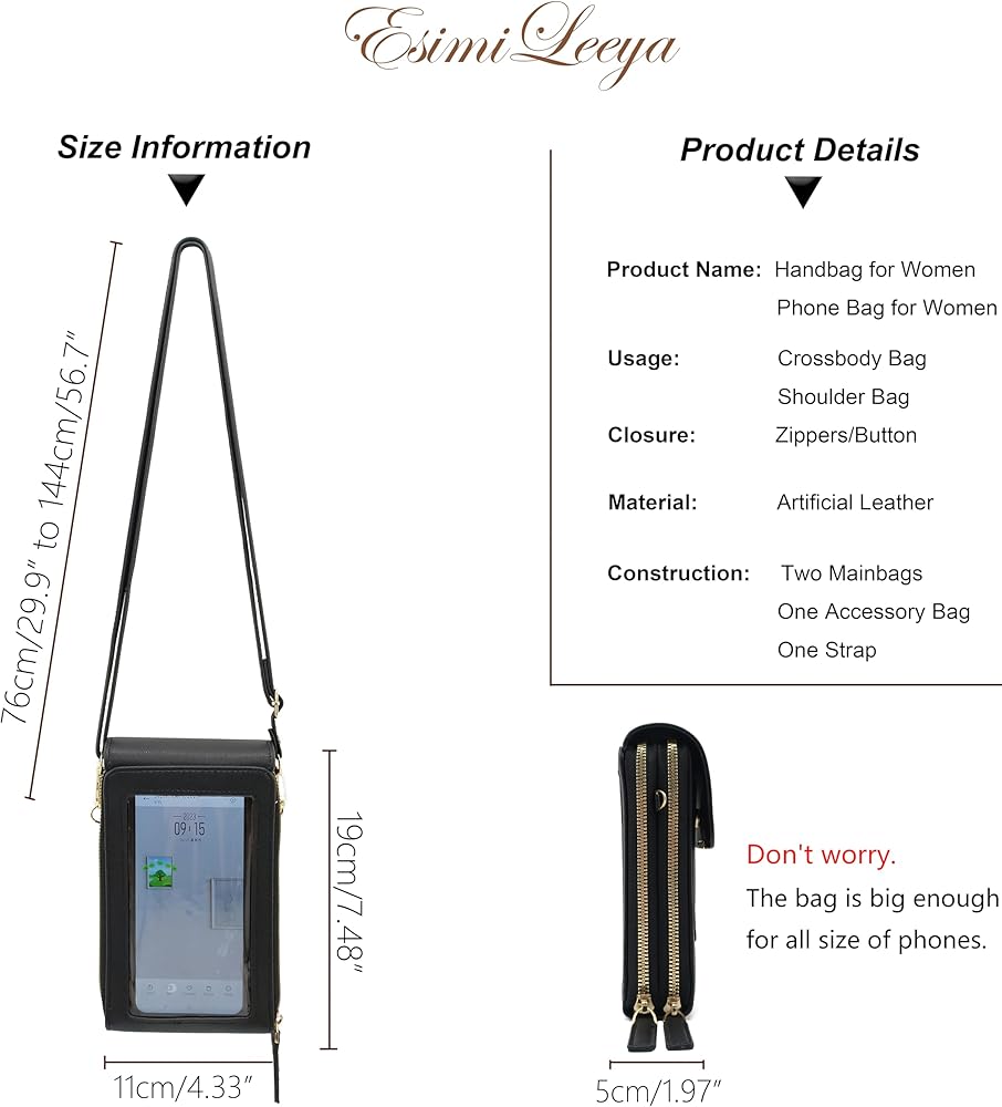 • Multifunctional crossbody touch screen phone bag: 1.Cell phone purse crossbody,you can put your cell phone in,cell phone bag is hand free. 2. The crossbody wallet is with credit card slots. 3.Anti theft wallets for women with strap. 4.Other personal stuff holder: cash,coins,napkin,tickets,keys. 5.Touchable screen,allows you to operate from outside.