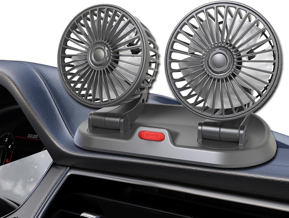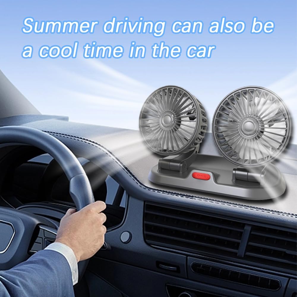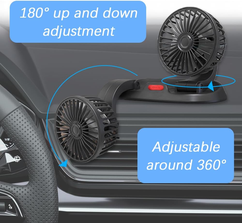 [360 degree adjustable]: This Car Foldable Two Head Fan can rotate 360 degrees and can be expanded and folded. The ability to direct the airflow exactly where you need it, whether you are sitting or lying flat, will allow you to blow a cool wind.
