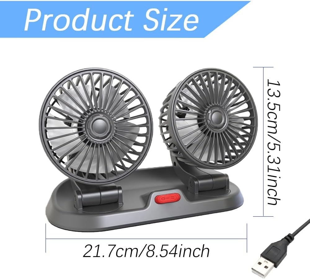 [USB charging]: This Car Dual Head Power Fan uses USB 5V interface charging. Only need to plug the charging head into the USB plug can be charged at any time, so that you can enjoy the cool wind for a long time, so that you feel more comfortable during the driving process.