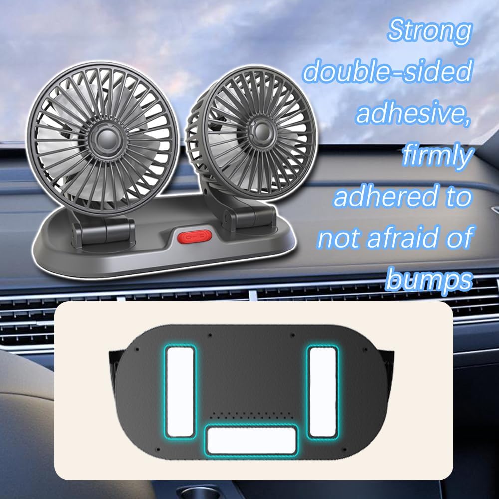 [Easy to install]: The installation process of this adjustable car two head small fan is very convenient.You only need to attach the strong double-sided adhesive that comes with the package to the base of the fan, and you can firmly fix the fan to the dashboard. This double sided tape will not harm the car interior, and is very strong, not easy to fall.And this fan is universal, such as you can also install it on SUV, RV, truck, boat, Sedan, home, office and so on.