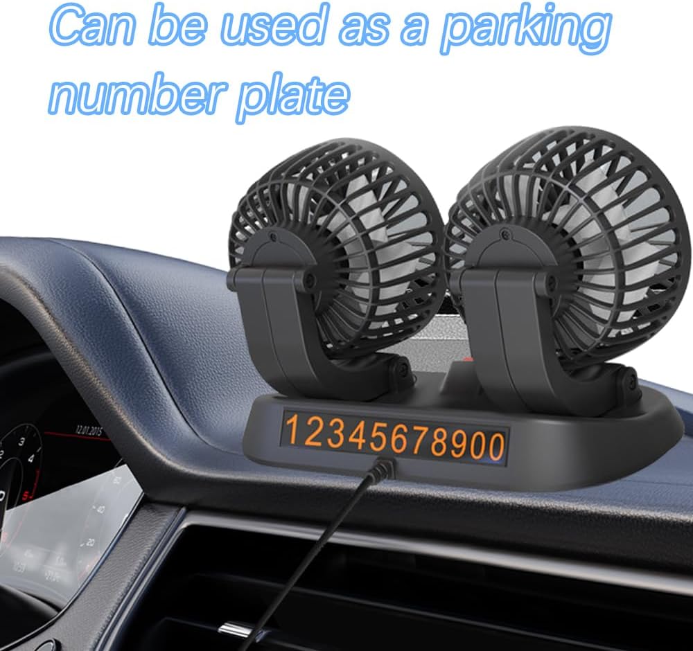 [Double head strong wind] : This Car USB Adjustable Fan has 2 powerful fans, and has 2 adjustable wind speed, which can effectively heat dissipation, promote the air circulation in the car, keep the air in the car fresh, and bring you a comfortable body temperature.This car fan also comes with a number plate, which can be affixed according to your contact number, which is very convenient and practical