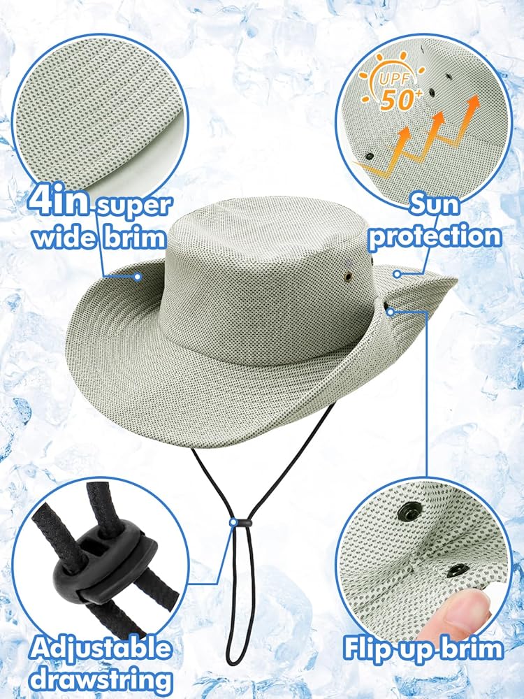 قبعة دلو تبريد - قبعة شمسية بحافة عريضة للغاية مقاس 4 بوصات للرجال والنساء، عامل حماية من الأشعة فوق البنفسجية 50+، قبعة صياد سريعة التبريد مع حماية من الأشعة فوق البنفسجية للطقس الحار وصيد الأسماك والمشي لمسافات طويلة والبستنة باللون الرمادي