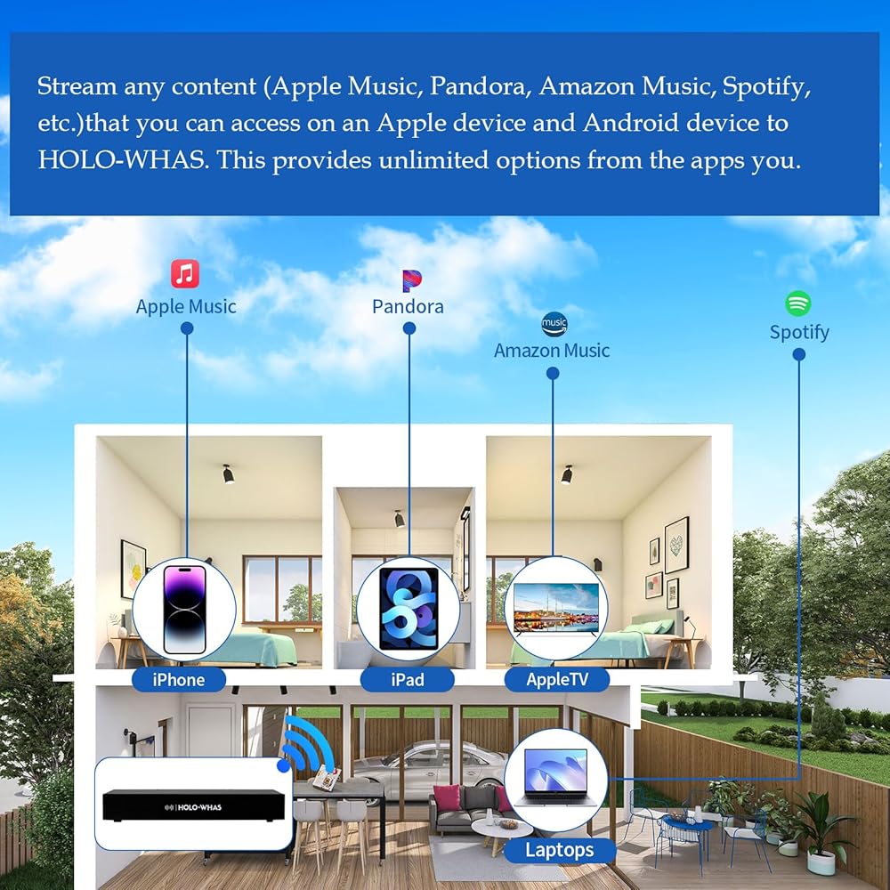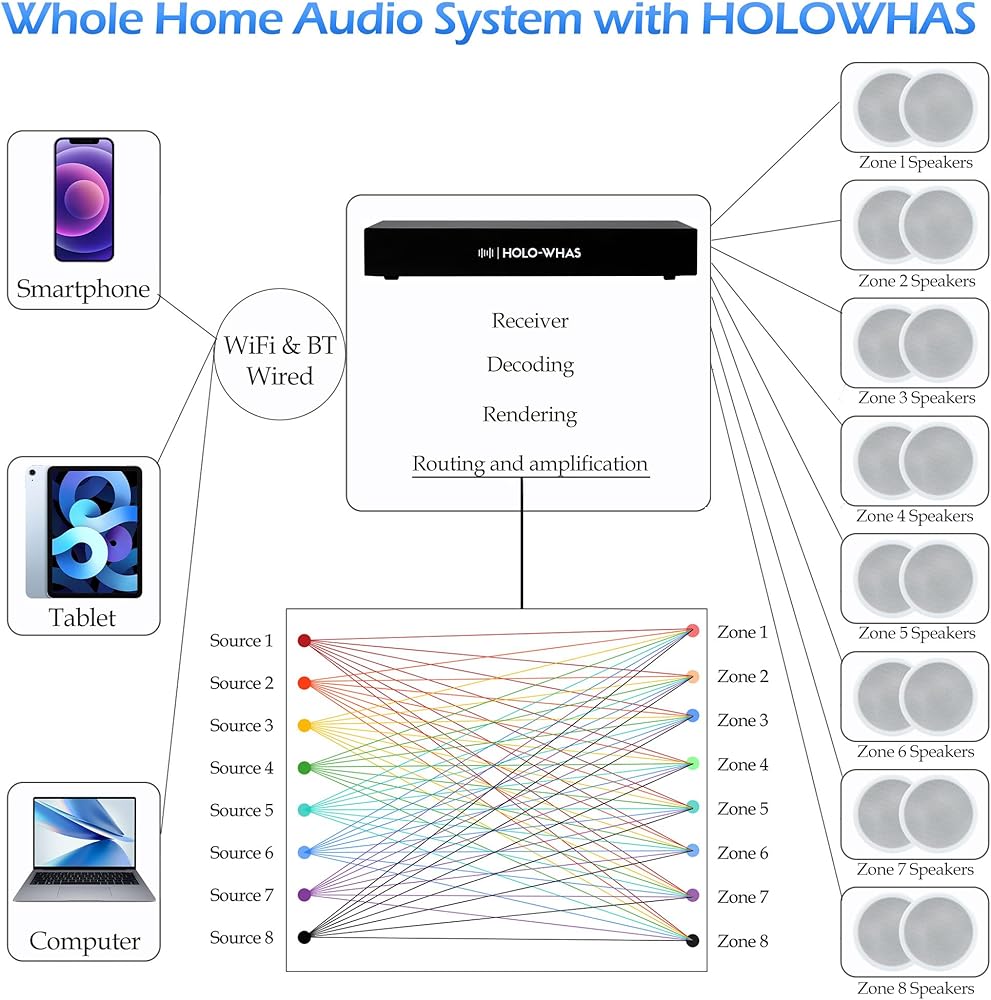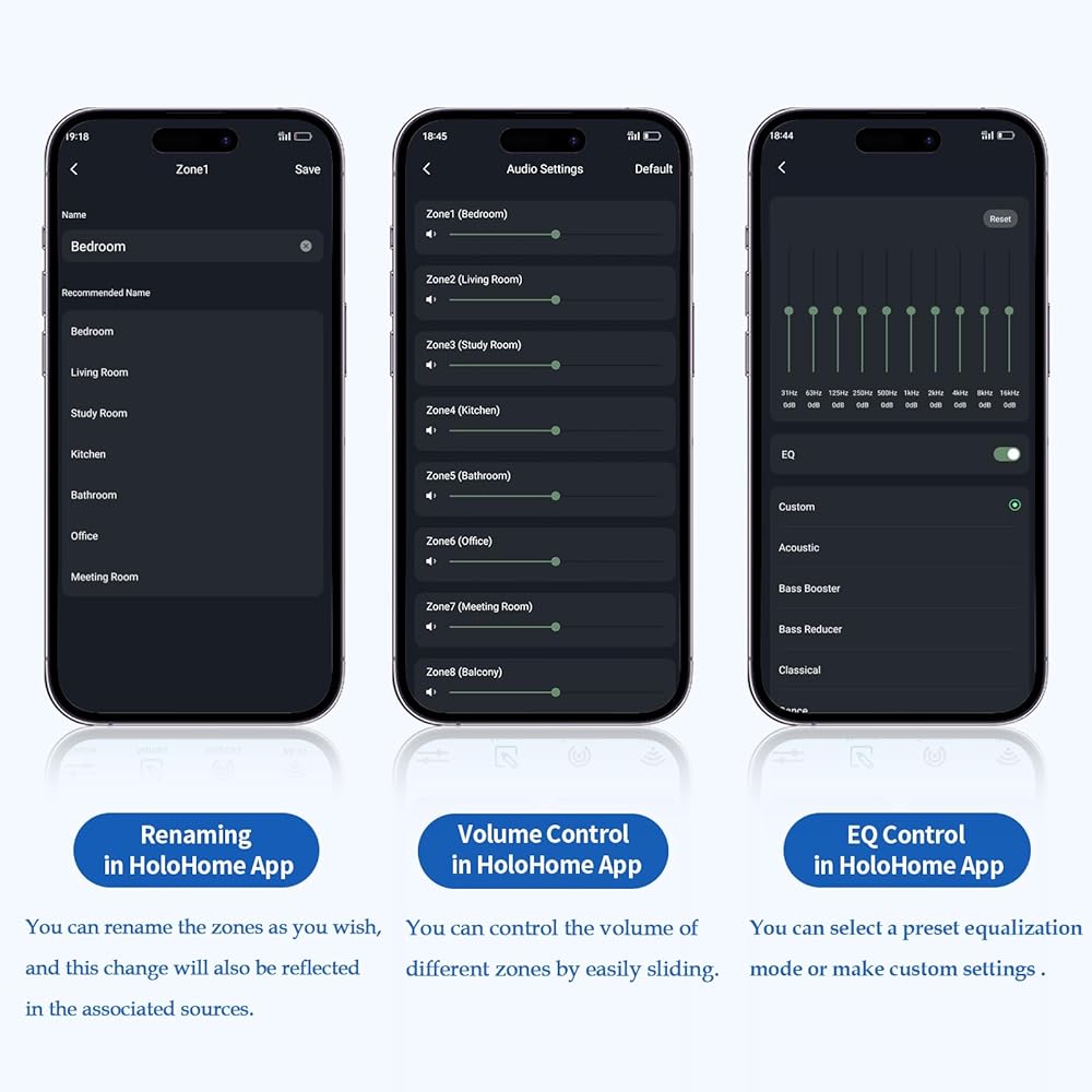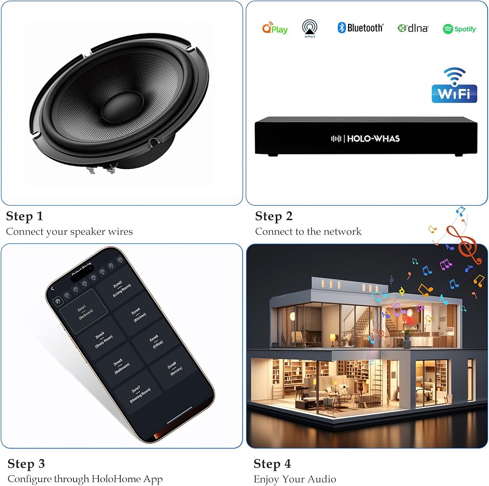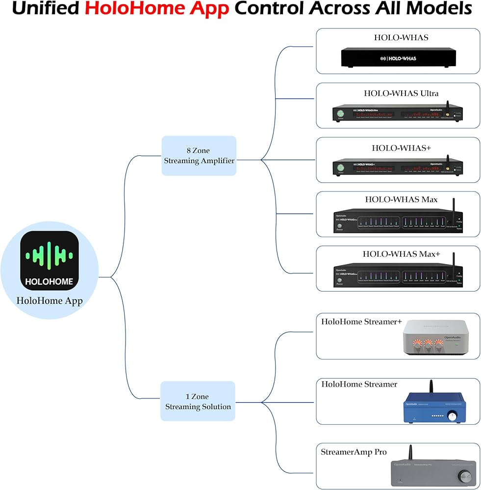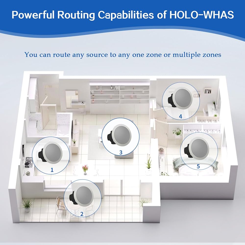 إعداد سهل للشبكة: يوفر تجربة محسنة خارج الصندوق (OBE)، مما يسمح للمستخدمين بإعداد شبكة HOLO-WHAS بسهولة من خلال تطبيق الهاتف المحمول دون الحاجة إلى نقطة اتصال WiFi. - يتم توجيه عملية الإعداد، مما يجعلها بسيطة وسهلة الاستخدام. دعم متعدد المناطق: يدعم ما يصل إلى 8 مناطق صوتية مستقلة في وقت واحد. يسمح بتشغيل محتوى صوتي مختلف في غرف أو مناطق مختلفة، مناسب للمنازل أو المساحات التجارية أو قاعات المؤتمرات.