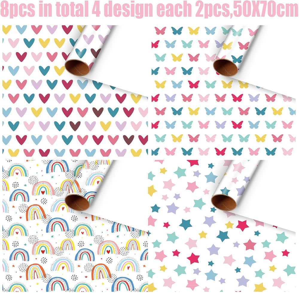 【Pakcage included】Include 8 sheets rainbow wrapping paper in 4 designs, each design has 2 sheets, sufficient to meet your different gift packing needs, perfect for party gift and art craft making. Notice: The wrapping paper is folded when delivery, the wrapping paper is likely to have creases. If you are concerned about this, please be careful about buying!