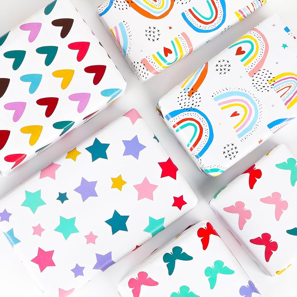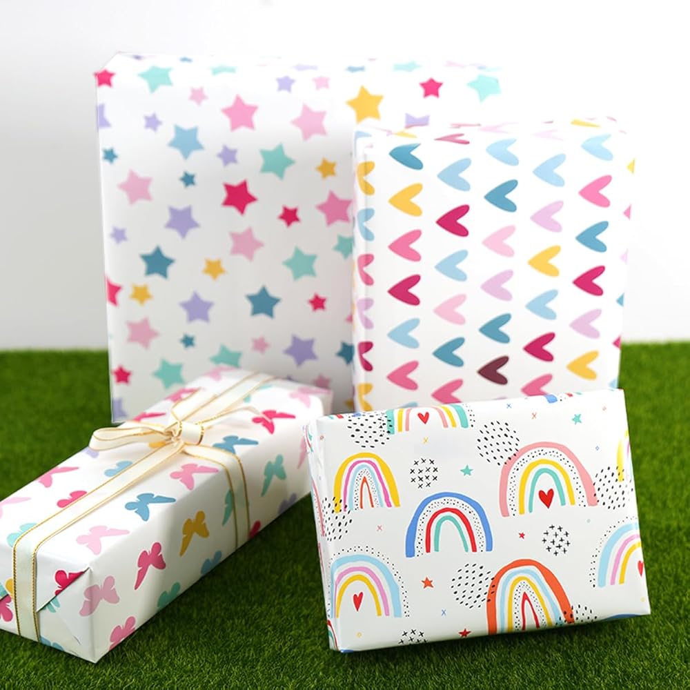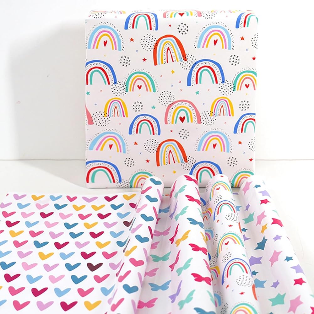 【Rainbow Wrapping Paper Set】Our paper take pastel pattern as the theme, printed with colorful rainbow, sun, stars, dots and butterfly. It's the perfect choice for adding a touch of elegance and femininity to any gift.