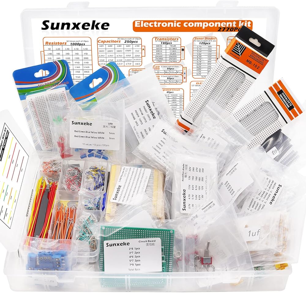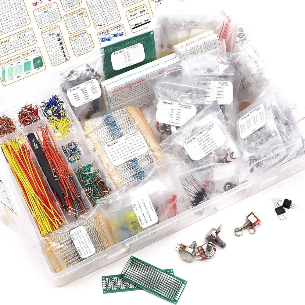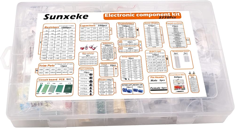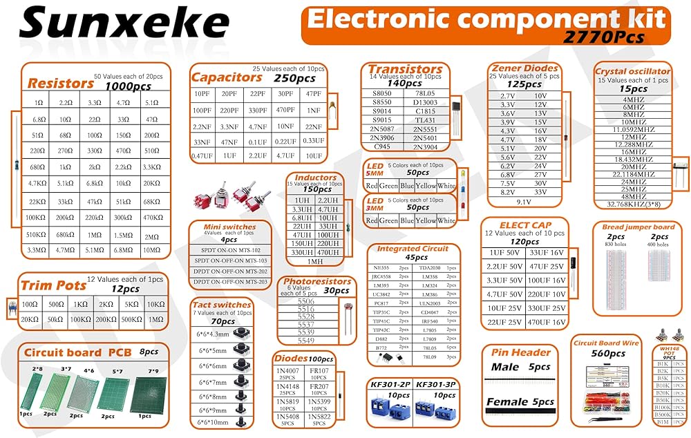 - يحتوي على مقاومات، ترانزستورات، صمامات ثنائية، محاثات، دوائر متكاملة، مذبذبات كريستالية، ثنائي الفينيل متعدد الكلور، LED، صمام ثنائي مقوم، وصلة خبز، مفتاح تبديل صغير، مفتاح براعة، مقياس الجهد.