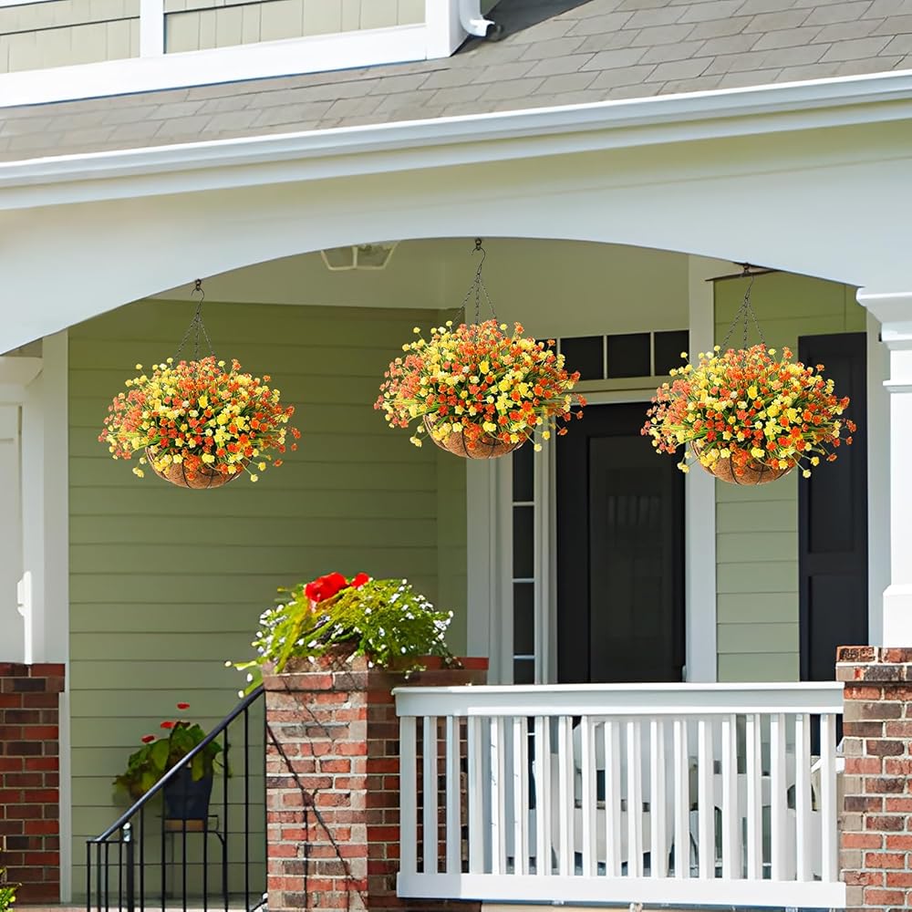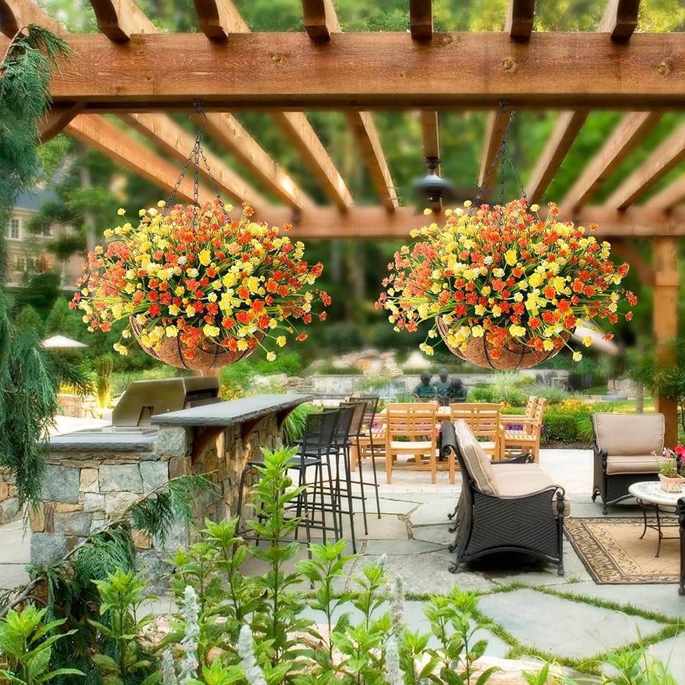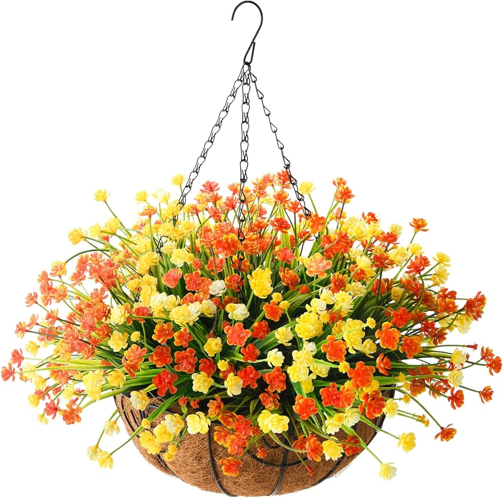 Homsunny زهور صناعية معلقة في سلة لتزيين حديقة الفناء في الهواء الطلق، ترتيب ديزي اصطناعي، نباتات وهمية في سلة بطانة جوز الهند مقاس 12 بوصة لديكور الربيع الخارجي (أصفر أحمر)