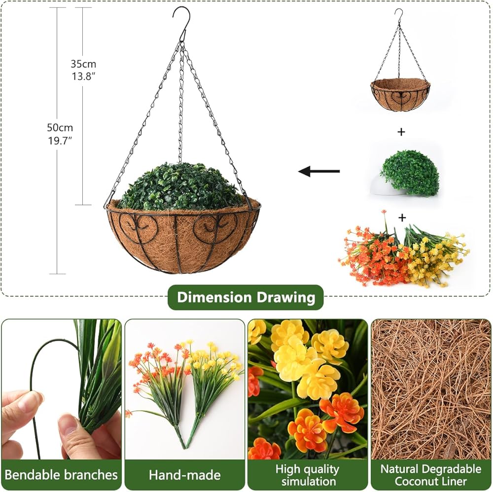 • الحجم: يأتي ترتيب الزهور المعلقة هذا مع زارع معدني مقاس 12 × 12 × 5.9 بوصة مع بطانة من جوز الهند وسلسلة مقاس 15.7 بوصة لسهولة التعليق. تبلغ الأبعاد النهائية حوالي 15.7 × 15.7 × 21.6 بوصة.