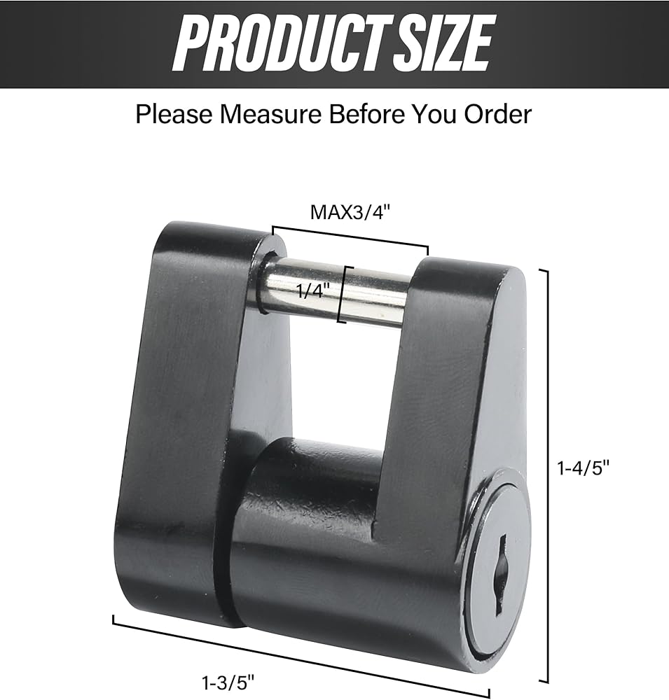 [Easy to Carry] Tongue shaped lock pin with a diameter of 1/4 inch and an effective length of 3/4 inch. Small size, easy to carry. Place the coupler lock in your pocket or any suitable place in the vehicle.