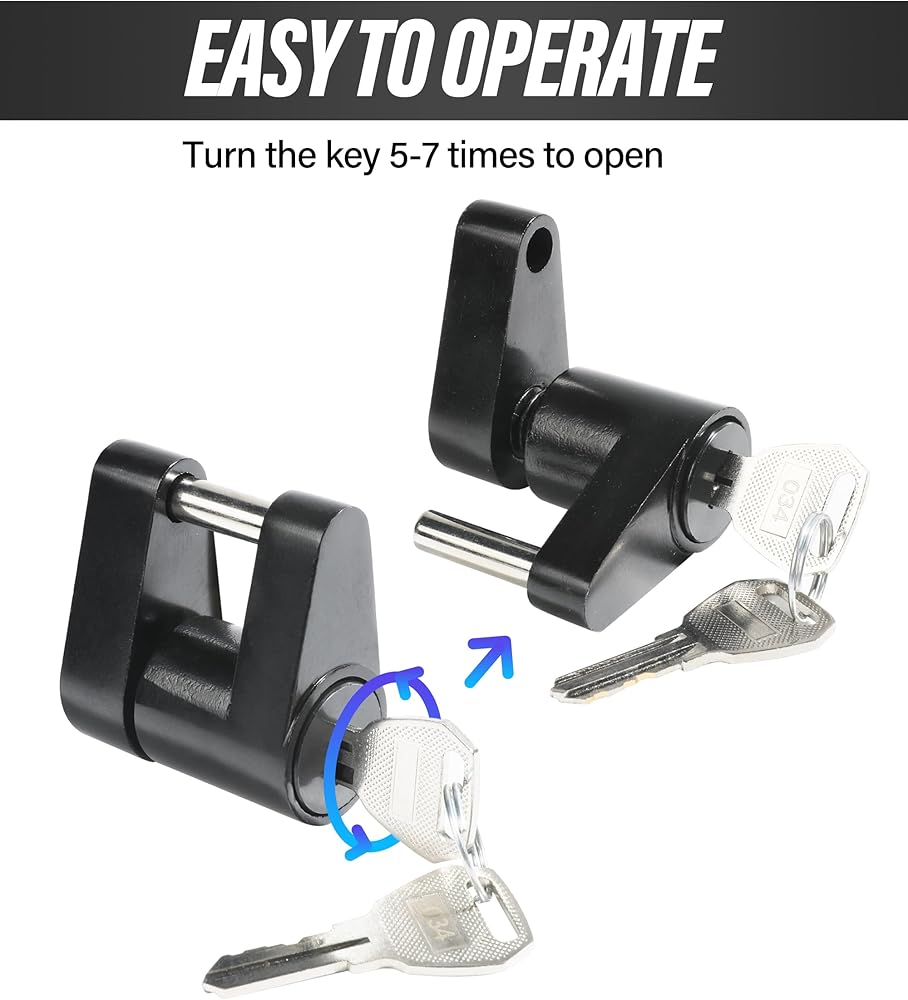 [Easy to Use] The trailer connector pin comes with two keys that you can keep in a separate place for future use. Use a simple 1/4 turn lock activation to facilitate locking and unlocking, simply rotate the flat key 5-7 times to open or close our hook lock pin.