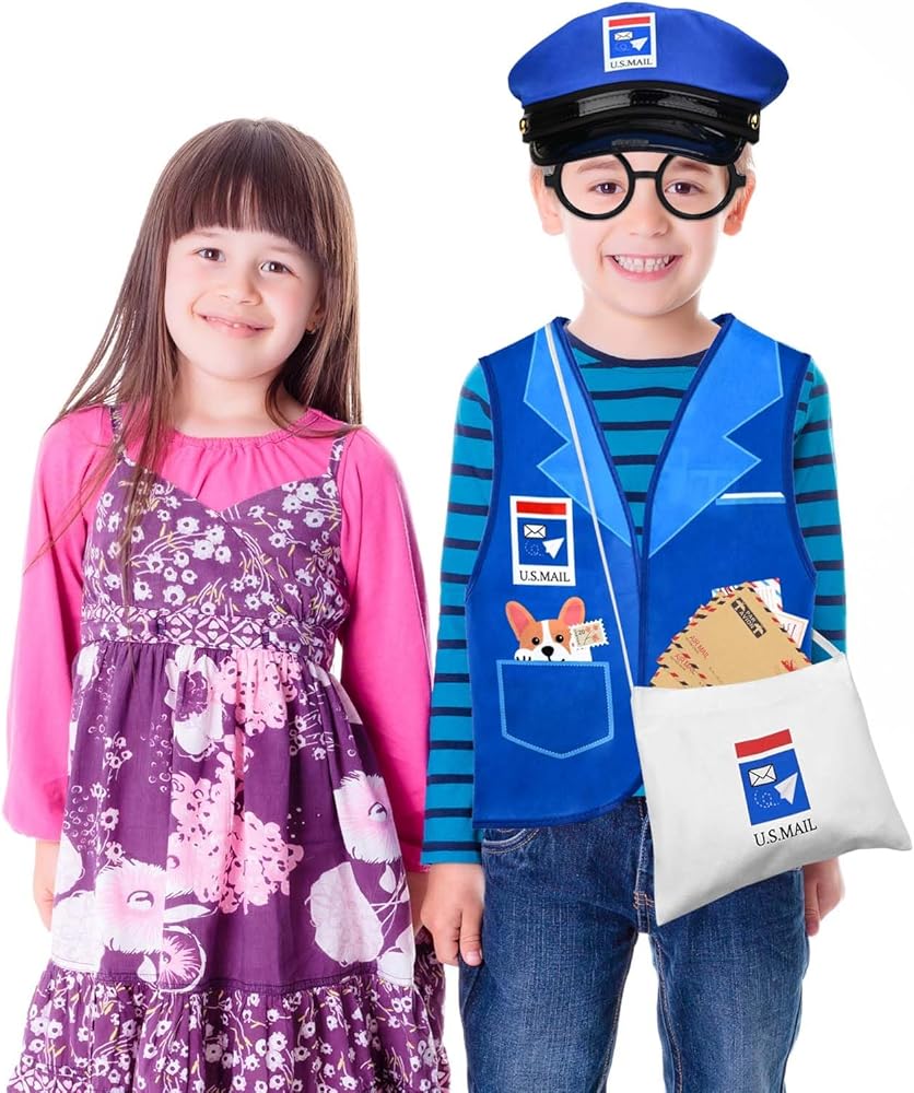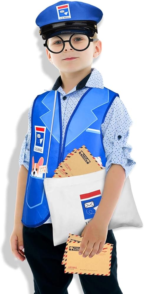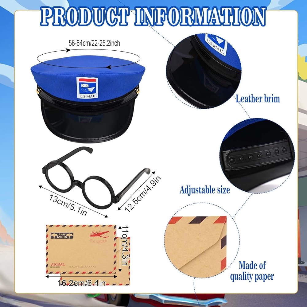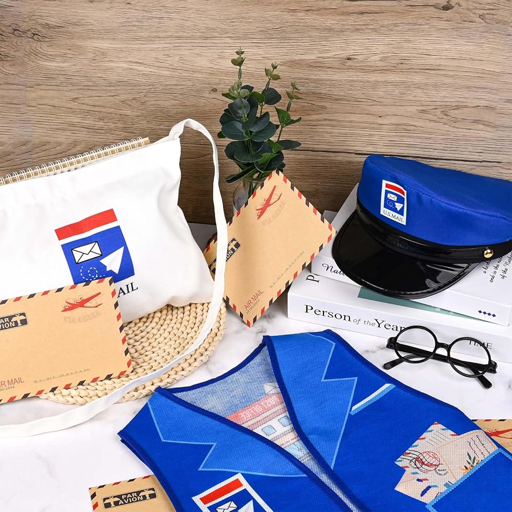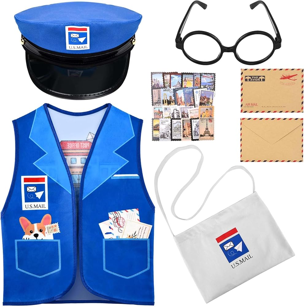 Package Include: This package includes a postman vest, a mailman hat, a mail bag, a pair of eyeglass frames, 10Pcs envelopes and 48Pcs stamp stickers. The number is enough to meet your daily use needs.