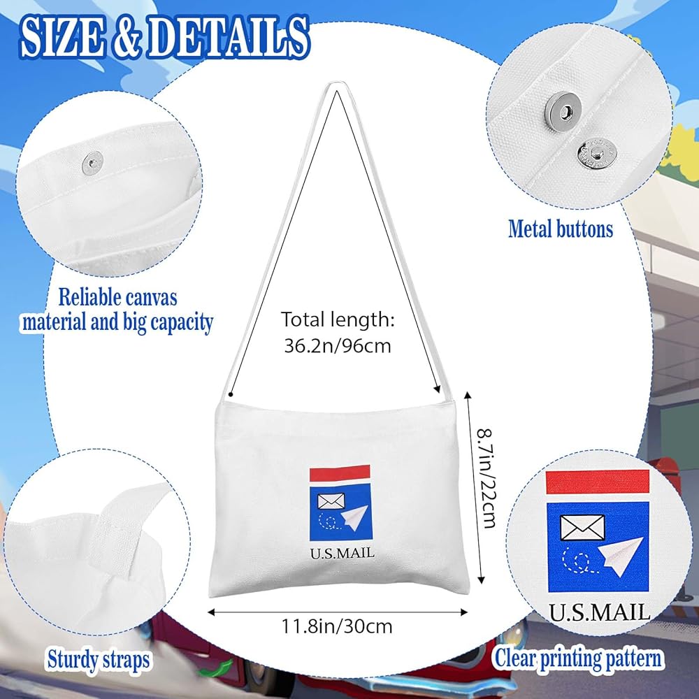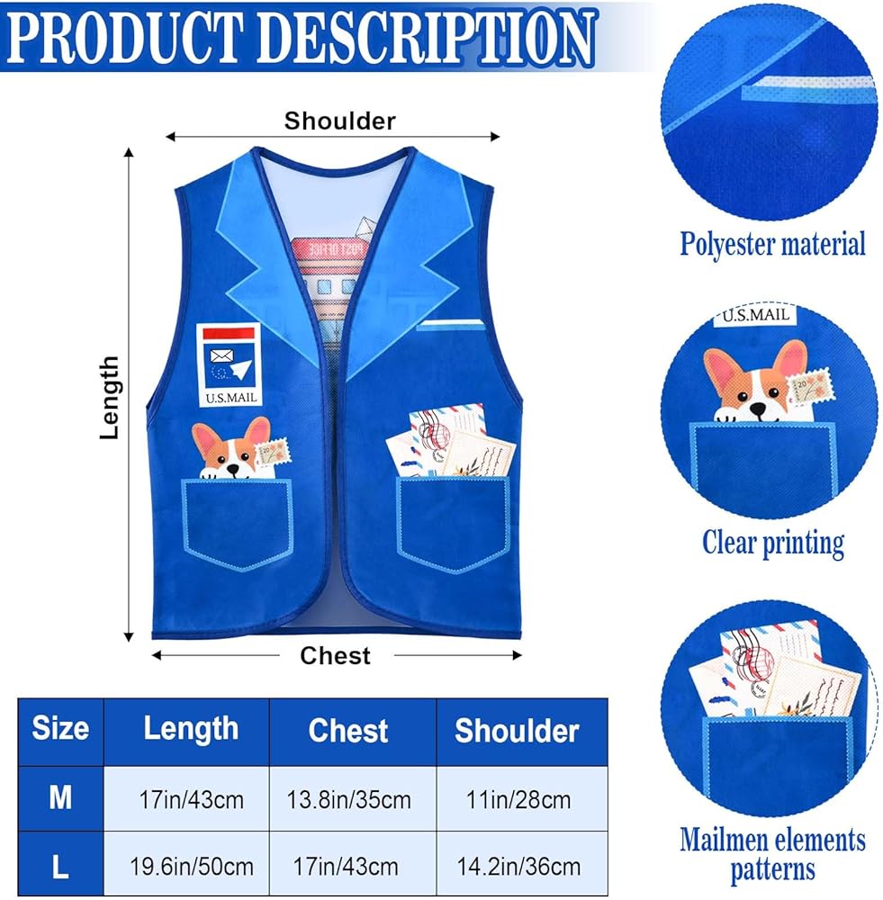 Size Detail: Two sizes available for postal clothing vest: M-17*13.8 inches/43*35 cm, L-19.6*17 inches/50*43 cm; The circumference of the postal hat is 56-64 cm/22-25.2 inches. The size of the canvas bag is 11.8*8.7 inches/30*22 cm, which can easily accommodate small toys, candy and envelopes. The envelopes, size 4.3*6.4 inches/11*16.2 cm.