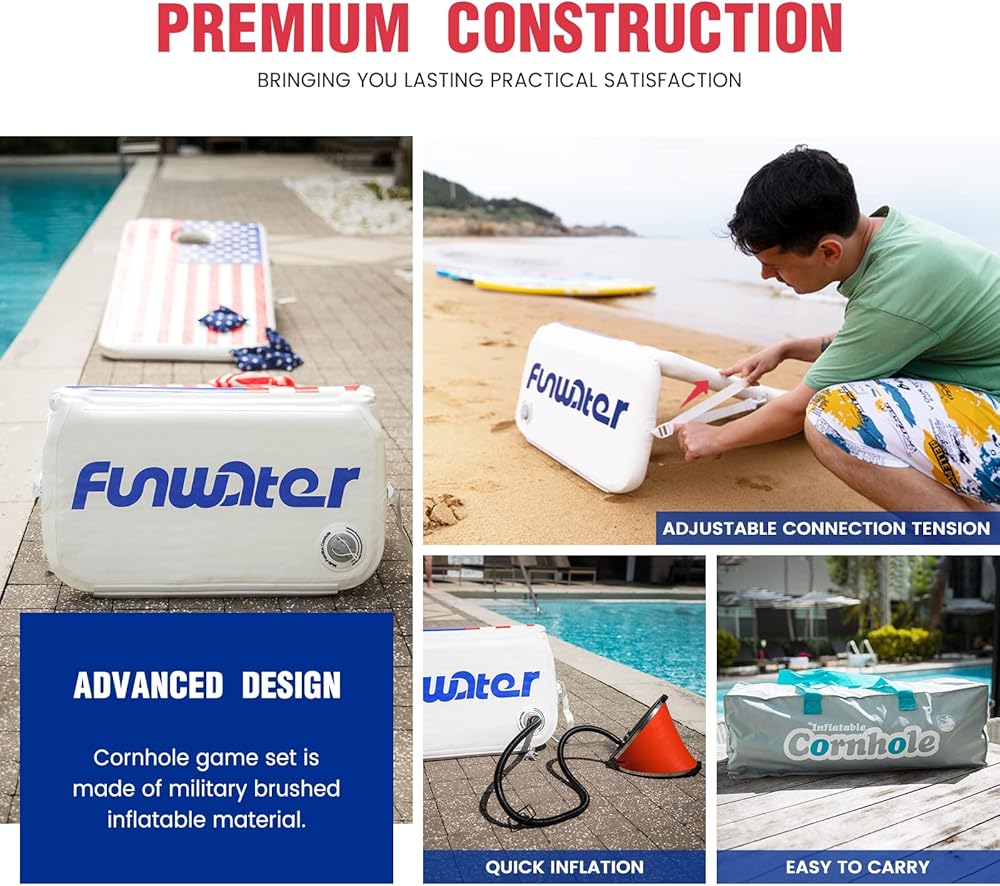 FunWater portable frame corn hole game set are a must for our lawn games on the go. That's why everyone loves this cornhole set. The fully collapsible cornhole set is made of brushed inflatable material, so it is very lightweight. It's easy to carry with you from one outdoor event to the next. The boards are easy to fold and store in a compact travel case, along with eight included bean bags. It can be played anywhere like parks, backyards, campgrounds, beaches, backyard, camping trips and more.