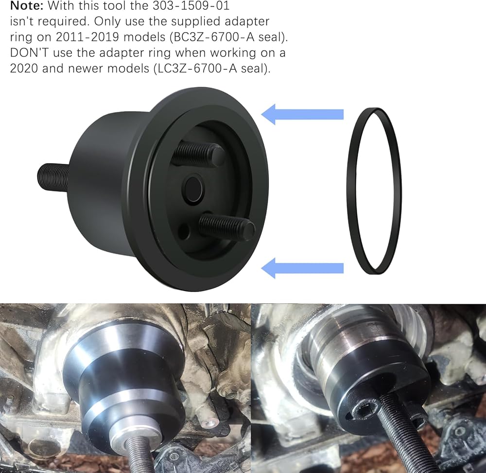 𝗨𝘀𝗮𝗴𝗲 𝗡𝗼𝘁𝗲𝘀: 303-1509 & 303-1509-01 6.7L أداة تثبيت ختم العمود المرفقي الأمامي، استخدم حلقة المحول المرفقة في موديلات 2011-2019 (BC3Z-6700-A Seal)؛ لا تستخدم حلقة المحول عند العمل على موديلات 2020 والموديلات الأحدث (LC3Z-6700-A Seal).