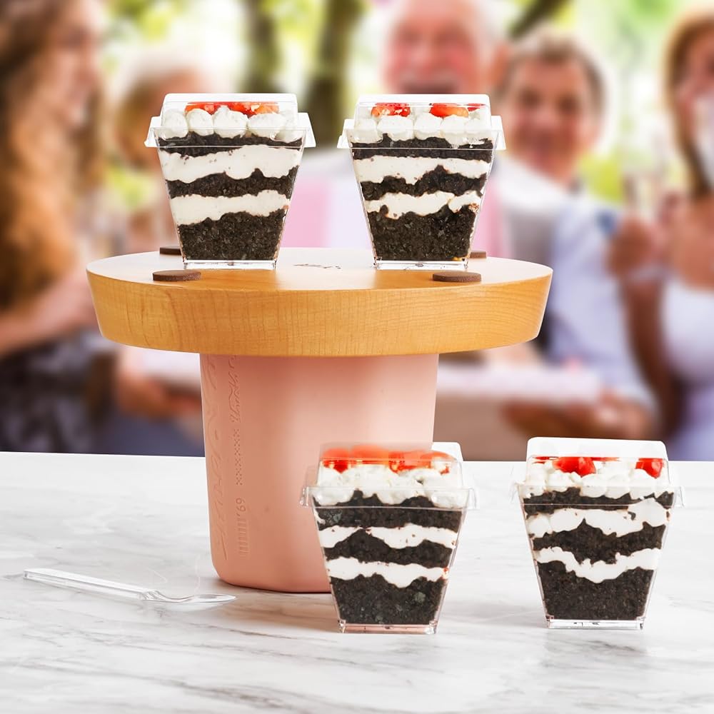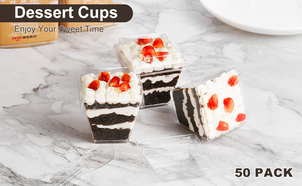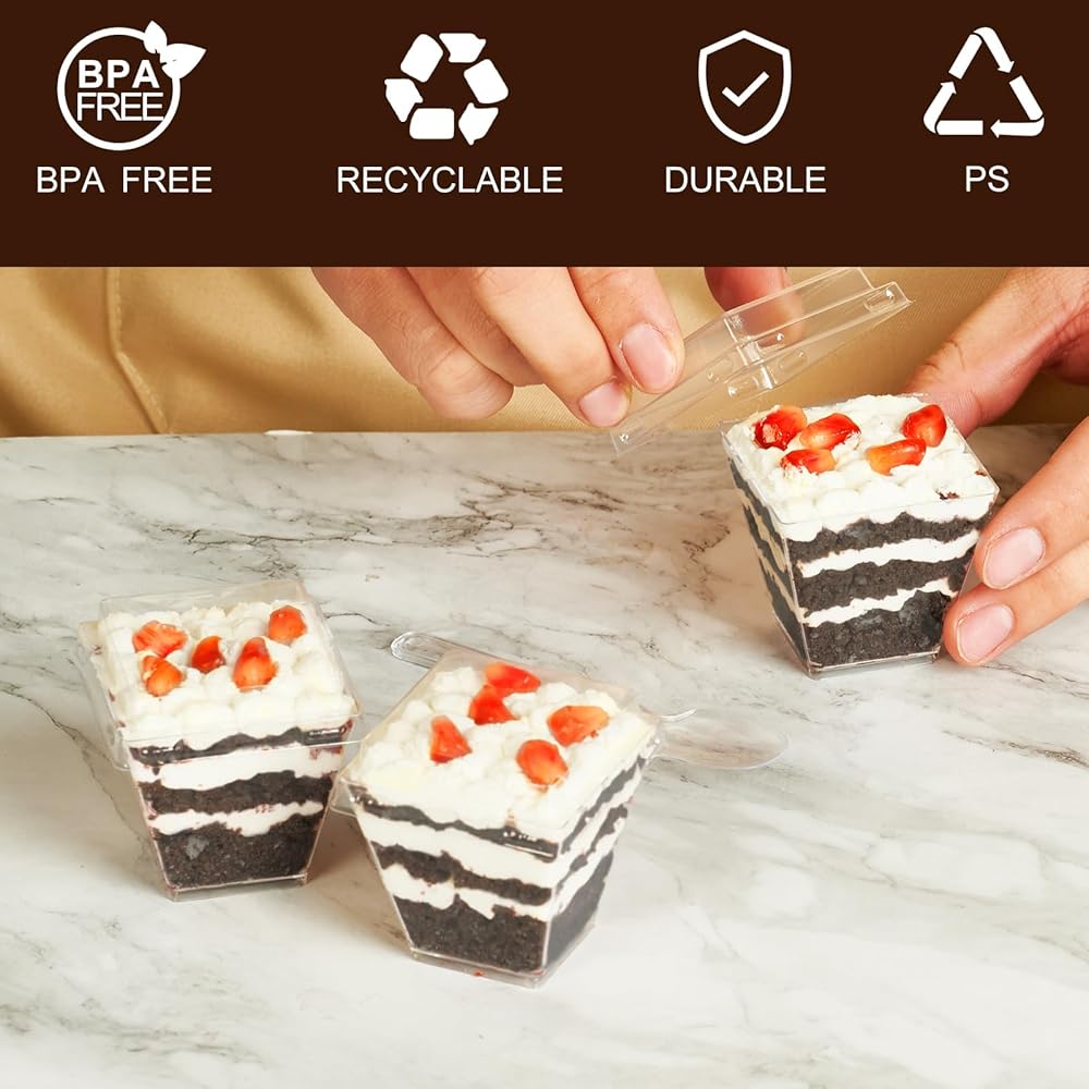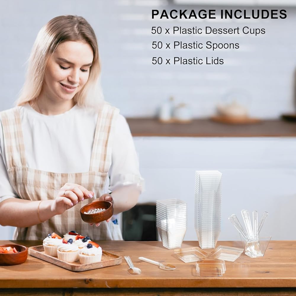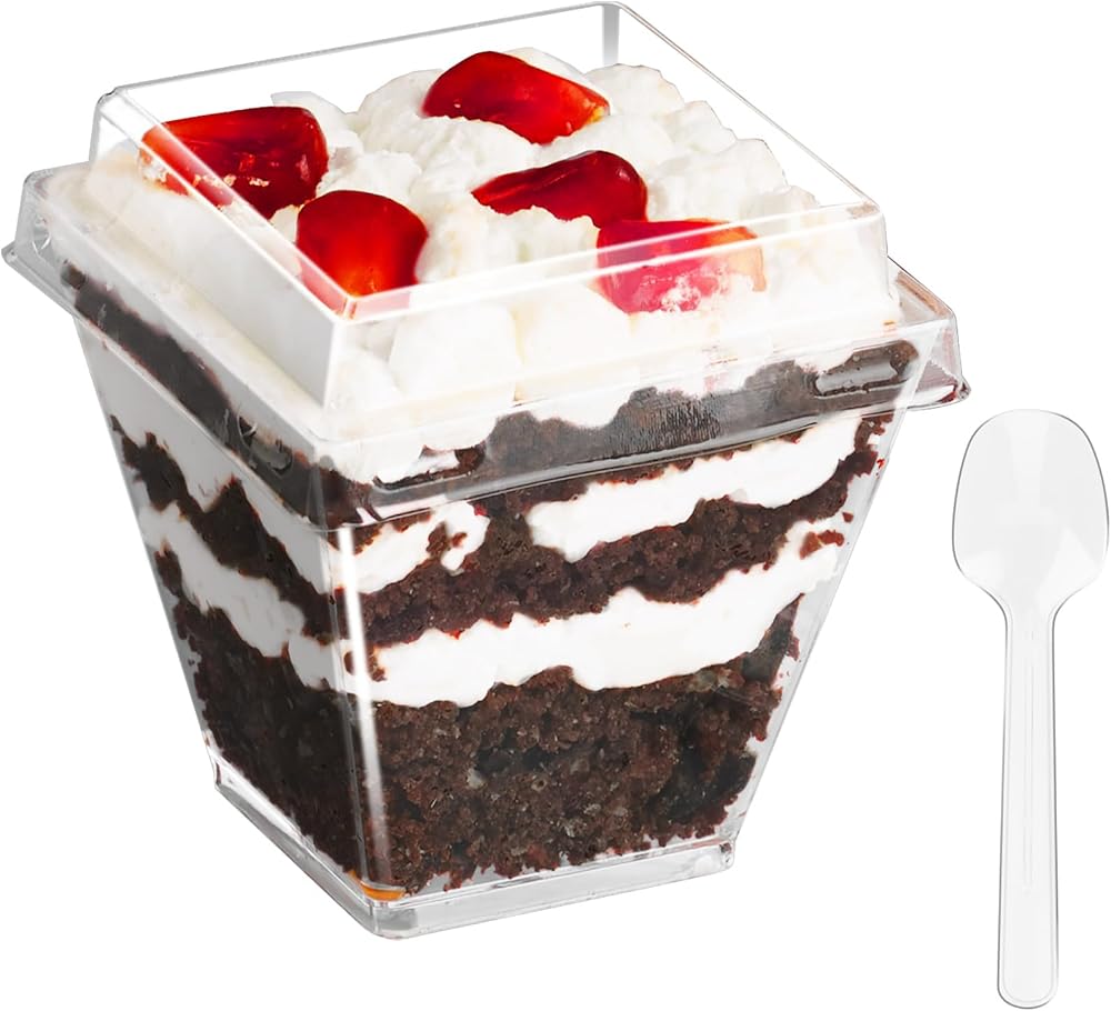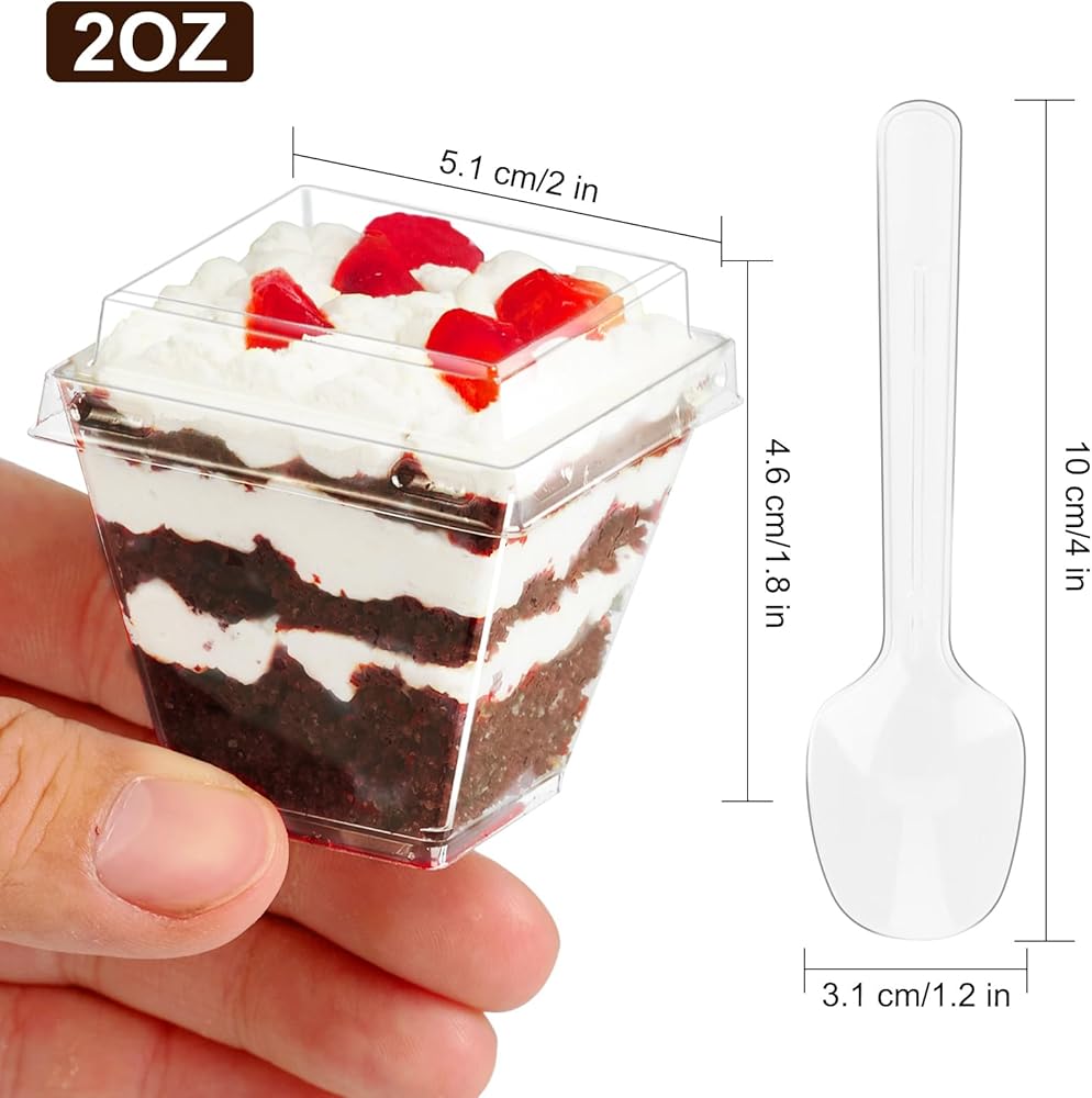 أكواب حلوى باراسيتي بوزن 2 أونصة مع أغطية وملاعق، 50 قطعة من أكواب بارفيه بلاستيكية مربعة صغيرة مع أغطية، أكواب حلوى للاستعمال مرة واحدة للكعك والفواكه