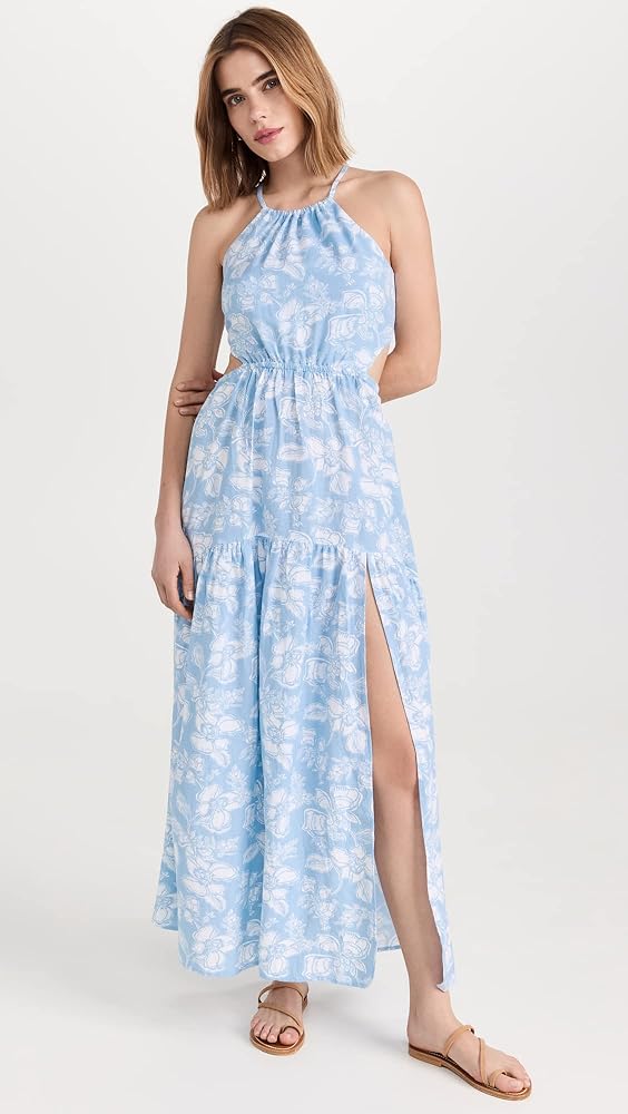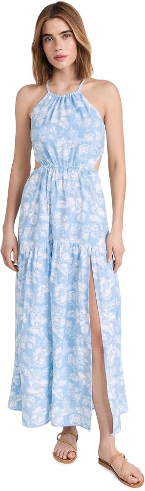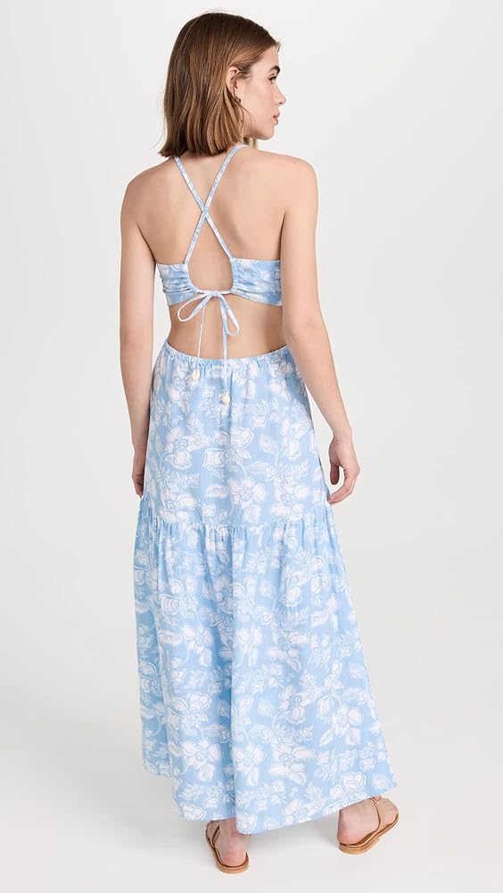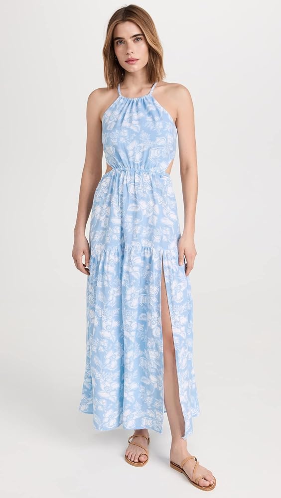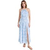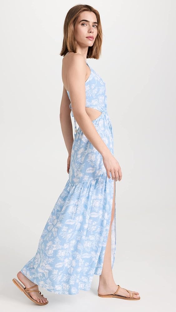 A polished cover-up option, this sky blue L*Space dress features a muted print, a deep front slit, and a comfortable open back.