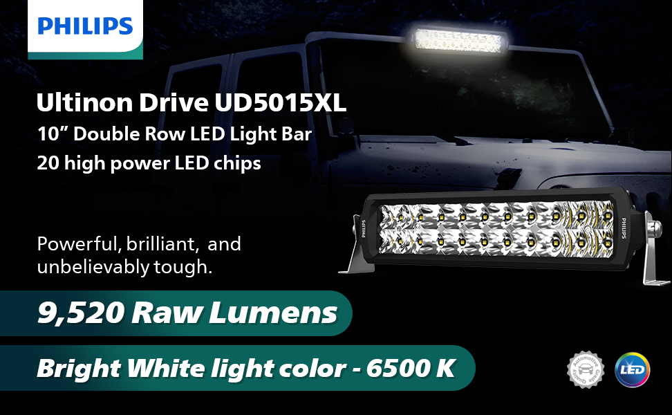 PERFORMANCE & STYLE: Provides outstanding beam performance with brilliant illumination that extends up to 1278 feet. Superior 6500 Kelvin light with 9520 raw lumens. Using high power LEDs, the Ultinon Drive series provides ample visibility for faster reactions. Philips light bars are designed with a style that can withstand the toughest off-road and weather conditions.