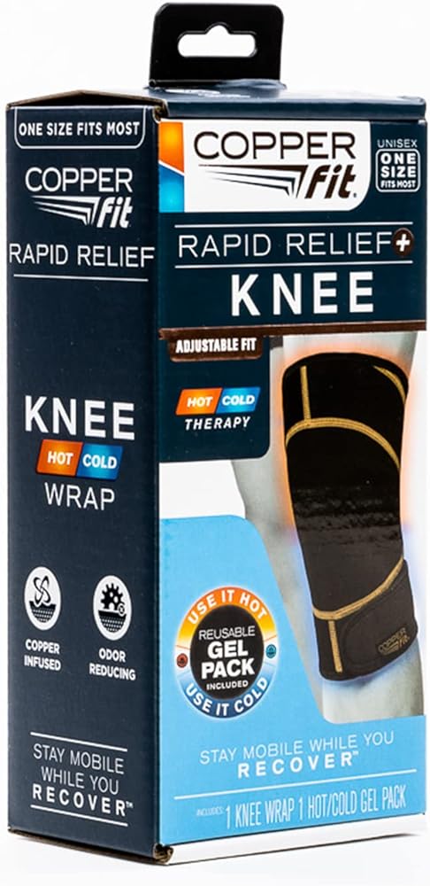 Copper Fit Rapid Relief Knee Wrap with Hold/Cold Therapy is the ultimate knee wrap for active people with knee pain. Adjustable and comfortable, this knee wrap helps you ice your pain away while still being on the go. Not enough time in the day to do your PT? No problem. Targeted pain management with hot and cold therapy makes sure that your knee pain is no more. Copper Fits Relief Wrap features a one-size-fits-most anatomically designed wrap for each body part that delivers hot and cold therapy so you can remain mobile. The wrap is crafted with an adjustable strap and an interior pouch for the pliable hot/cold gel pack. The wrap is designed to provide even surface coverage for hot or cold therapy. Compatible with the best knee braces and ice packs on the market. Suitable for Men and Women 13 and Up.