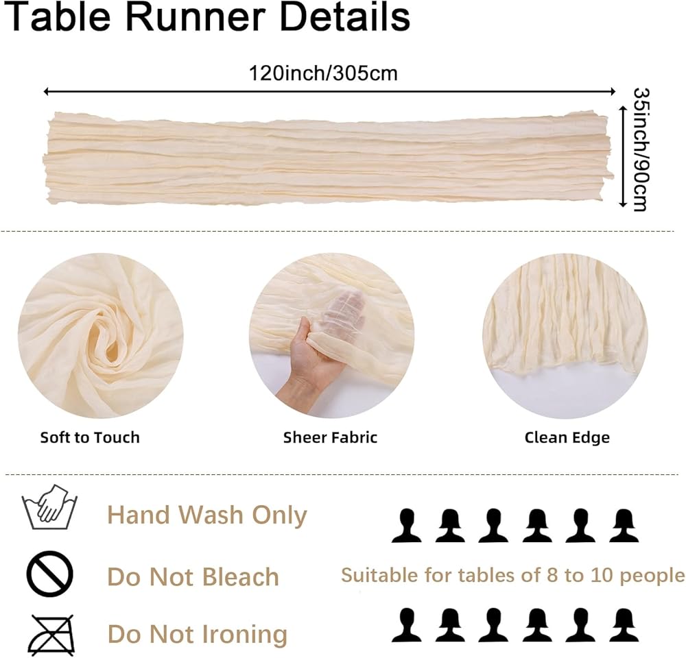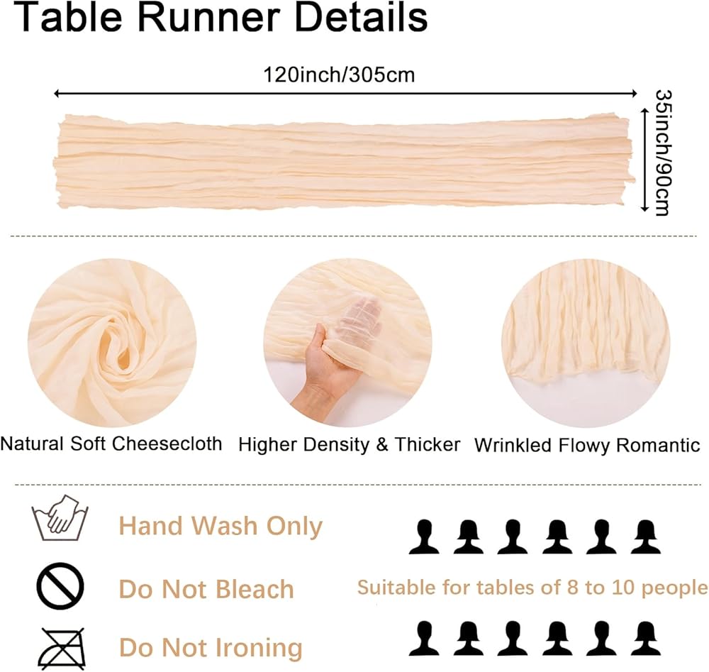 المقاس: 18 قطعة من مفارش المائدة المصنوعة من قماش الجبن بطول 10 أقدام، كمية كافية للحفلات والولائم. يبلغ مقاس كل مفرش طاولة 35x120 بوصة/90x300 سم عند فرده بالكامل. ولكننا عادة نبقيها مجعدة للحصول على مظهر أنيق ورشيق. الحجم الطويل جدًا يسمح لها بالثني بشكل لطيف على جانب الطاولة. وسوف تتأرجح بلطف في مهب الريح.
