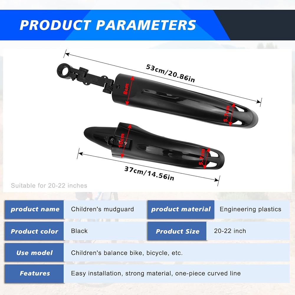 Optimal Size Compatibility: Designed for 20 to 22-inch wheels, these children's bike fenders are versatile and suitable for various bike types including mountain bikes and road bikes, providing effective protection against water and mud splashes.