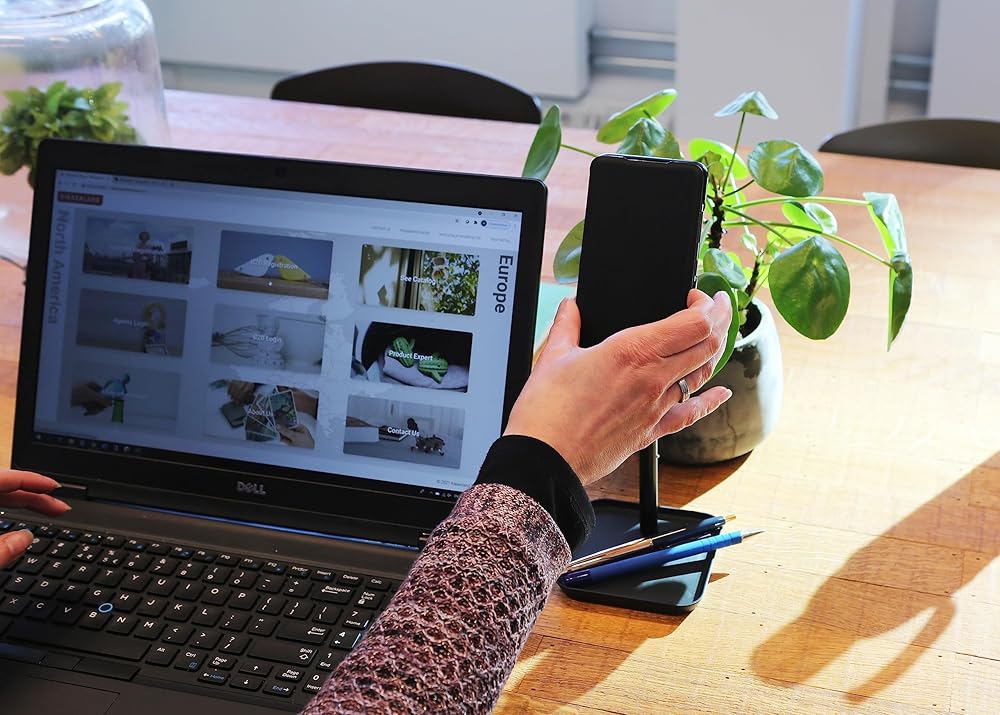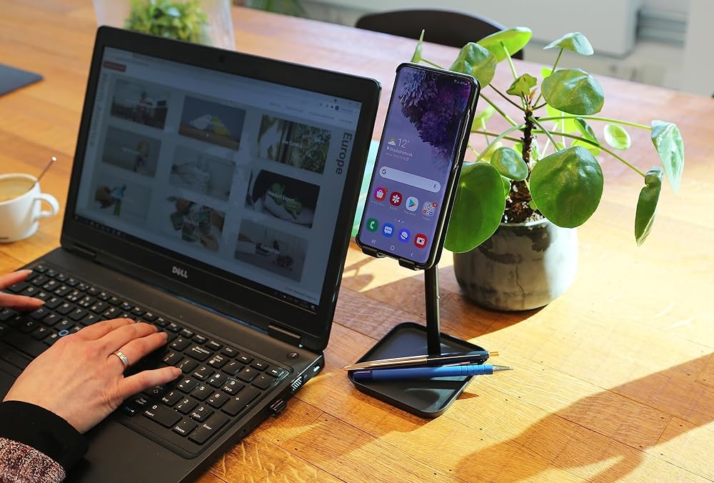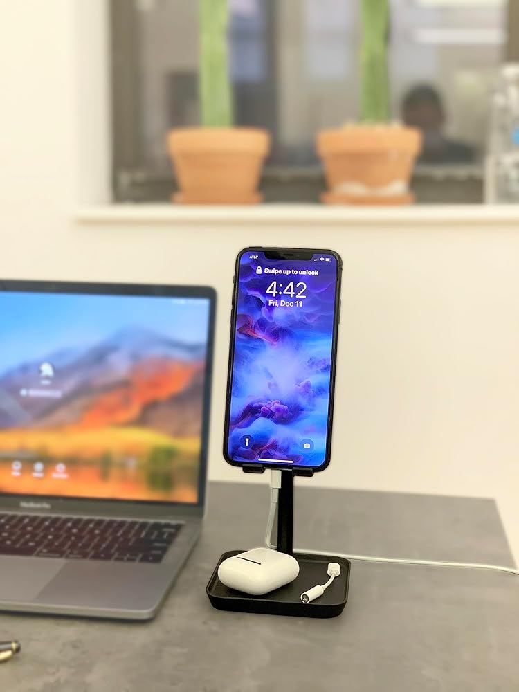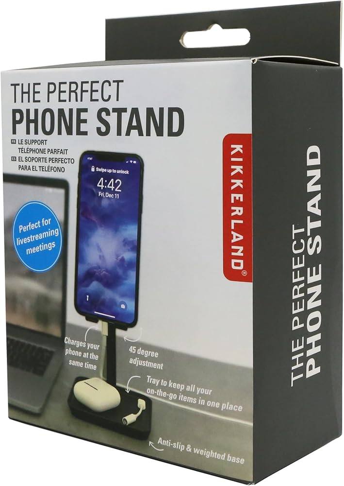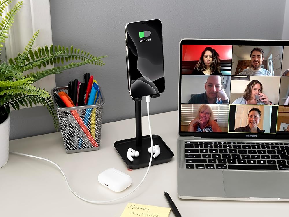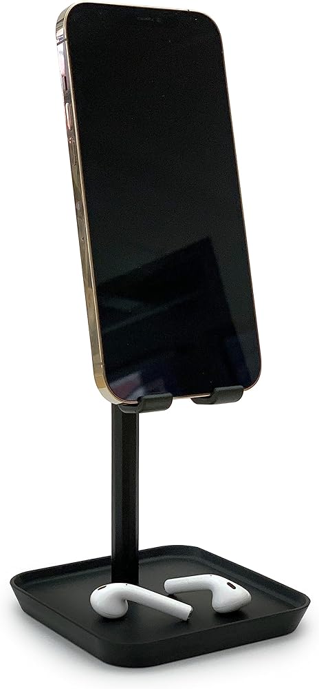 Sturdy stand designed to let you place and use your smartphone or tablet at a comfortable viewing height on your desk or table. The incorporated tray is useful for holding earbuds, USB cables and small office items.