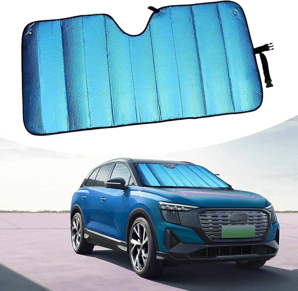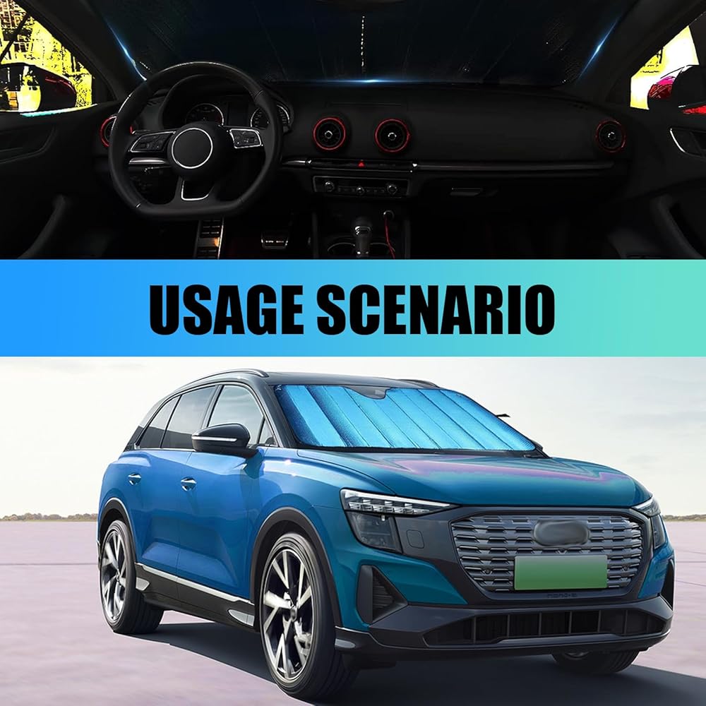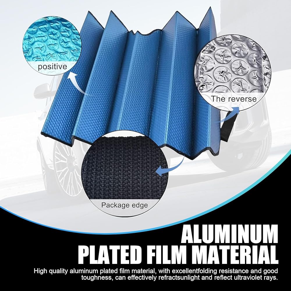 • Cool Comfort: The surface layer of this car front windshield sunshade uses a reflective layer for heat insulation and built-in honeycomb bubble insulation. It has good light-blocking properties that improve the driving experience in hot weather and is an excellent barrier against strong sunlight.